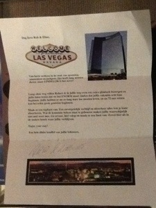 Het inchecken ging heel goed, we waren te moe voor de 20 dollar trick of het vragen om een complimentary upgrade. We kregen daar wel een super leuke verrassing; er lag namelijk een welkomstbriefje op ons te wachten van Ard en Robert.