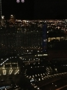 De koffers waren dus terecht, dat betekende dat we weg konden naar de Car Rental. Weer tien minuten met de shuttle, dit keer een privé bus, we zaten er met ons beiden in 🙂 . Daar alle papieren laten zien, bleek dat de computers het niet deden en alles met de hand moest worden ingevuld. Het duurde even, maar we werden erg vriendelijk geholpen. Vervolgens de papieren mee om in de parking garage aan een volgende persoon te laten zien en dan mochten we een auto mee. Nou de onvriendelijkheid droop van die vrouw af. We kregen eerst een auto toegewezen waarvan de afstandsbediening van de sleutel het niet deed. Ach no problem dat kan dan doe je toch alles met de hand, de batterij was waarschijnlijk leeg. Nou, dat dachten wij dus even niet! Batterij vervangen of een reservesleutel, daar doen ze niet aan… mevrouw werd nog chagrijniger, maar uiteindelijk kregen we toch een andere auto mee, een Ford Focus sedan. Natuurlijk wel allemaal automaat dus dat is toch wel erg wennen voor Rob. Eigenlijk doe je niets met je linkervoet…. Maar ja als je maar even de rem aanraakt dan sta je al stil dus wat is Rob blij dat we zo laat de auto oppikken en dat de Strip redelijk uitgestorven is, voor Vegas begrippen dan. Na zo’n tien minuten rijden, en een paar keer bijna tegen het raam geplakt te zijn bij het remmen voor een stoplicht, komen we aan bij de valet parking van Vdara. Daar de auto achter gelaten en de koffers uit de auto gehaald.