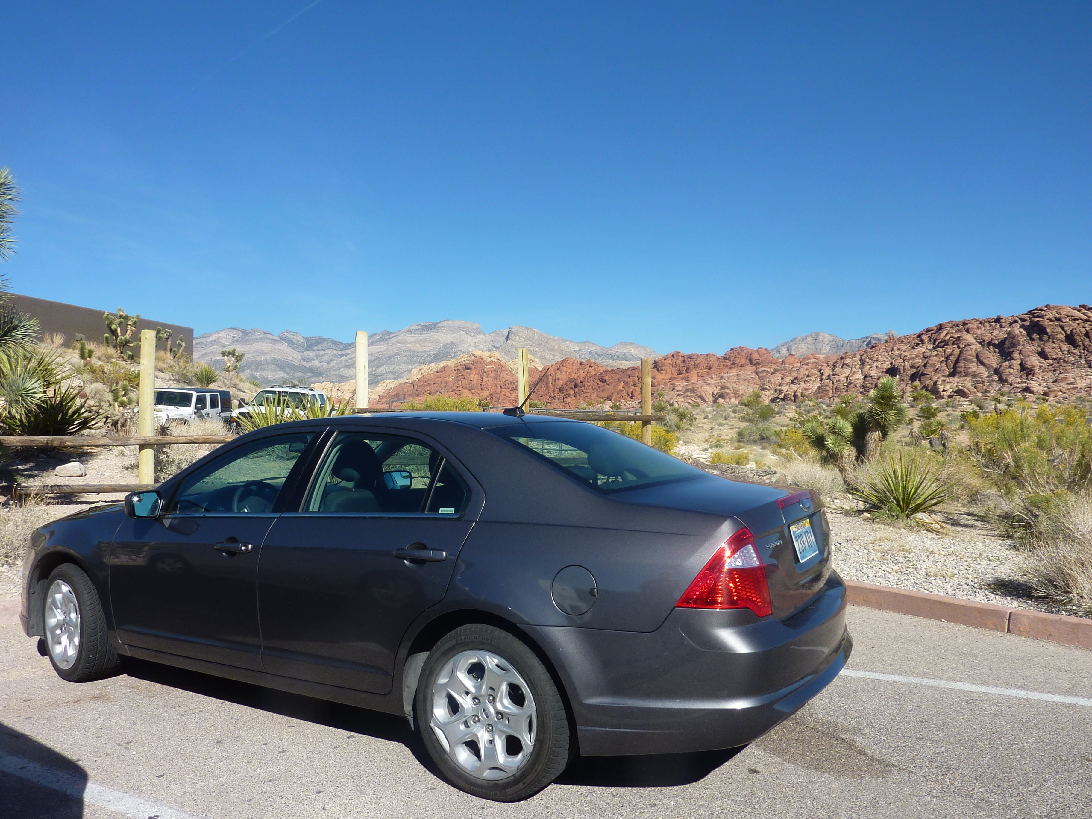 Dit is onze huurauto in Vegas (hij staat hier bij Red Rock Canyon), een mooie Ford Fusion. De auto werd klaargezet en we kregen de sleutels en toen begon het uitzoekwerk.De stoel was naar achteren verschoven en de motor was uit. Twee dingen die Rob niet precies wist op te lossen en toen een van de parkeerders kwam dat ze de daarnaast geparkeerde limo wilden gebruiken moest hij toch maar aan die jongen vragen waar de startknop en de verstelknop van de stoel zaten. Starten moet vanuit de P-stand. Ach ja dat moet je weten. En het verstellen ging met dezelfde knop als hoger en lager zetten van de stoel. Maar toen dat was opgelost kon het linkerbeen gaan slapen, want in een automaat doe je alles met rechts en dat lukte heel goed. Met een automaat rijden is erg rustig en prettig.