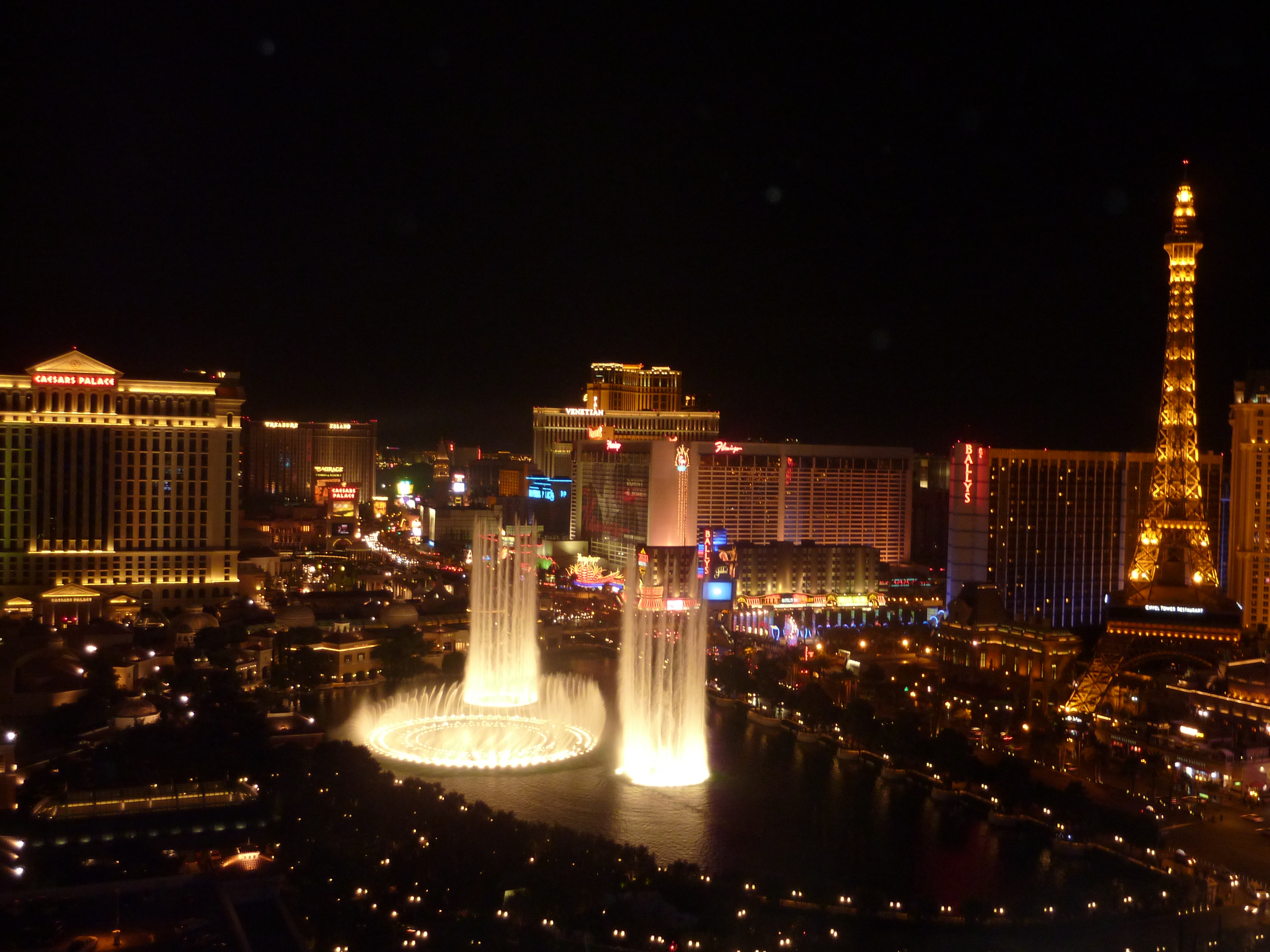 Daarna konden we door naar het inchecken bij Cosmo. Rob wilde een twenty dollar trick doen, maar had Eline daar niet meer over verteld en daardoor werd het verwarring en vragen om een upgrade. Die was er wel, iets luxere kamer met japanse tub, op de 61e verdieping, maar dan voor $40 per nacht. Dat hebben we toch maar afgewezen en we werden geplaatst op de 28e verdieping in de West Tower met uitzicht op de Bellagio Fountains. Op de kamer aangekomen, bleek dit echt niet verkeerd. Het Cosmo is een van de weinige hotels dat kamers heeft met balkon. Hier kan je dus echt goed naar de fonteinen kijken. Echt geweldig! Verder is de kamer super, een grote ‘woonkamer’ met hoekbank, grote douche en maar liefst 2 tv’s op ongeveer 4 meter afstand van elkaar 🙂