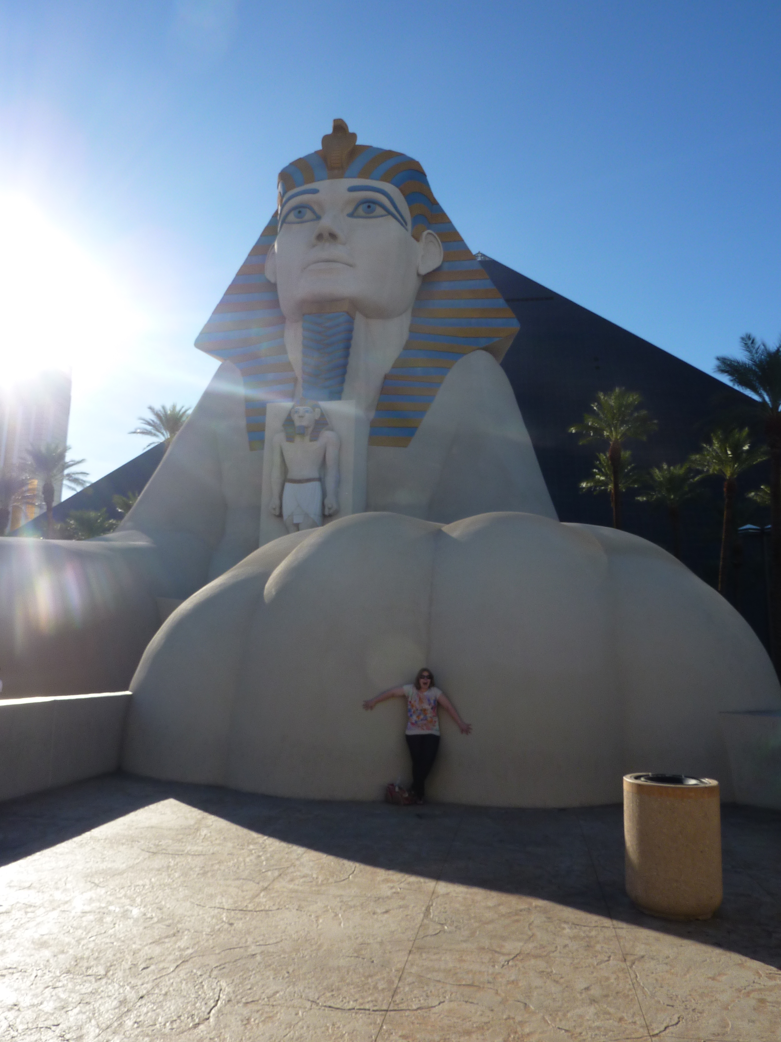 Lopend zijn we richting New York-New York gegaan, genoten van het mooie gebouw en alles daaromheen. Besloten dat we niet in de attracties wilden (New York- New York heeft diverse achtbanen) en vrij snel doorgelopen naar het volgende hotel, Excalibur. Excalibur is een mooi hotel met allerlei torentjes en een erg magische uitstraling. Vanaf hier hebben we de tram genomen naar Mandelay Bay, dit hotel hebben we een beetje links laten liggen, we wilden graag naar Luxor. Dus gelijk weer met een andere tram die ons naar het Luxor bracht. Luxur is volledig in Egyptische stijl, een piramide met een flinke sphinx ervoor.