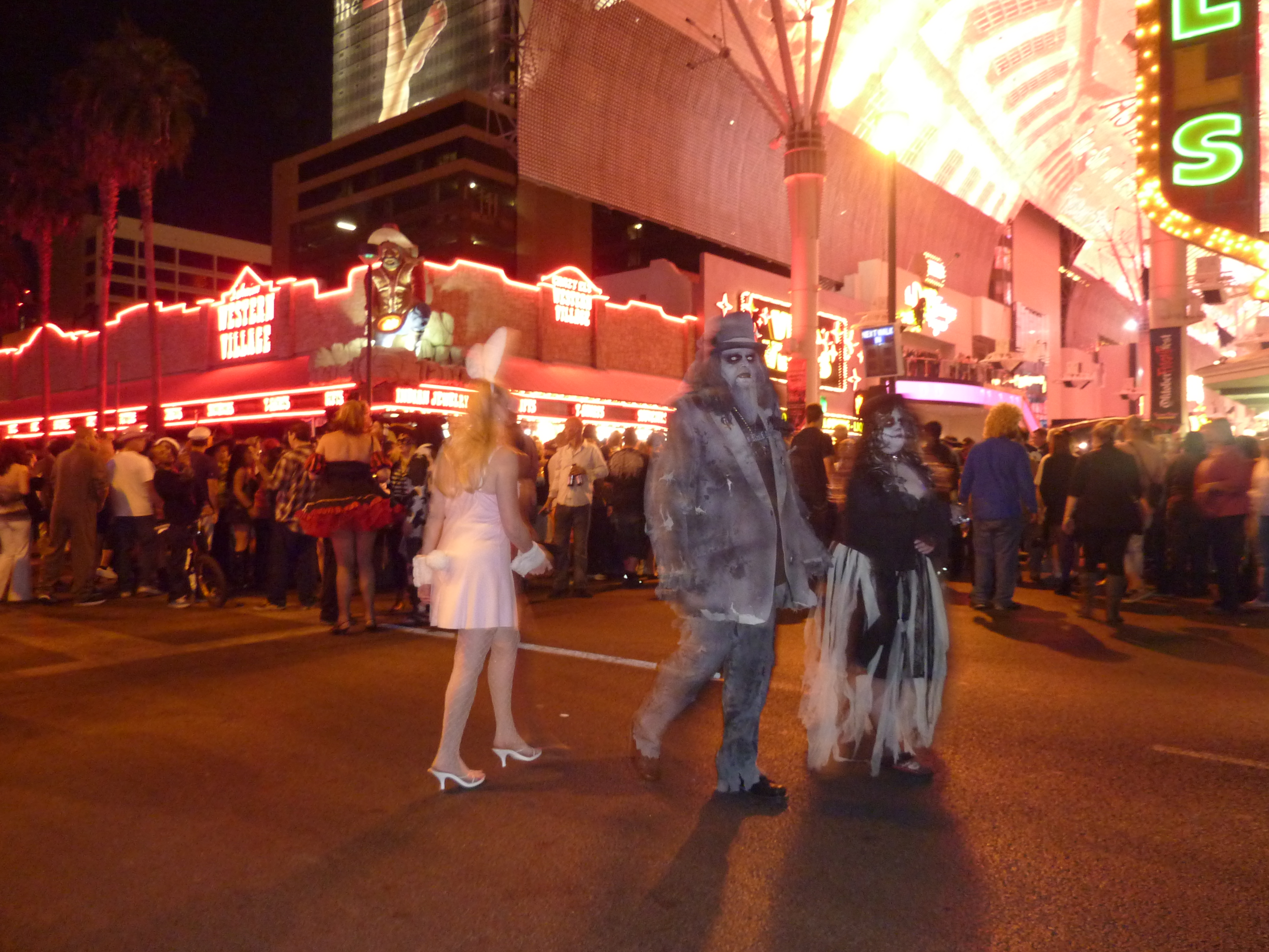 Binnenin zie je ook allerlei Egyptisch aandoende beelden en de vorm van de piramide komt hier heel erg terug. Best een mooi hotel en casino. In het Luxor waren bovenin een aantal leuke winkels, onder andere een sportwinkel Score, van waaruit live een sportuitzending voor de radio werd gemaakt. Erg leuk om te zien! Ook kon je hier een paar tentoonstellingen bezoeken, er was er één over de Titanic en de andere was met de bekende ‘Bodies’, de lijken die op diverse manieren ontleedt zijn waardoor je een heel bijzondere kijk op de anatomie van de mens krijgt. Op zich had ik Bodies wel willen zien, maar Rob zag dit niet helemaal zitten, dus dit heb ik toch maar overgeslagen :-). Natuurlijk hebben we ook nog even gegokt in het Luxor! In het begin ging dit niet echt geweldig. Totdat Rob op een gegeven moment zei: ‘zullen we op zoek naar de Monopoly automaten?’ Ja hoor prima! Wij het casino door op zoek naar die automaten… had ik ze eindelijk in het vizier, wilde Rob ineens achter een Elvis automaat gaan zitten… pffffffffff, nou ok, prima, maar ik ga Monopoly spelen 😉 haha. En maar goed ook, deze automaat was mij gunstig gezind! De ene na de andere keer kwam het Monopoly mannetje om in mijn spel diverse symbolen WILD! te maken of mijn score te vermenigvuldigen, ook kreeg ik het bonusspel. Al met al een hele poos leuk zitten spelen met zo’n $60 winst, Rob had ook winst, dus een geslaagd uitje. Helaas vloog te tijd! Aangezien we ’s avonds naar de Halloween Parade op Fremont Street wilden, moesten we ineens haasten. Snel nog even naar de andere Ross dress for Less op de Strip. Jammer genoeg waren hier voor ons geen koopjes te vinden. We hebben ons op de hotelkamer nog even opgefrist, hebben de auto laten halen bij de Valet parking en zijn op weg gegaan naar Fremont. Wonder boven wonder vonden we de parkeerplaats waar we eerder gestaan hadden redelijk makkelijk terug en ging er net voor onze neus een auto weg zodat we ook snel konden parkeren. Het was erg druk, dus dit was echt mazzel! Snel op weg naar de Parade, want die was al in volle gang. Wat een drukte overal, maar wat gaaf om mee te maken! Alle mensen die zich verkleden, de gepimpte auto’s, fietsen en andere voertuigen, echt super!