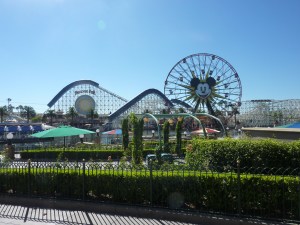 Zo rond half elf liepen we weer richting Disneyparken. Op het weerbericht hadden we gezien dat het nog warmer zou worden (34 graden en ja het is november en ja we zijn op het Noordelijk Halfrond!) Dus zijn we eerst naar de 7 11 supermarkt geweest om nog wat extra drinken in te slaan en om een calippo ijsje mee te nemen. Dat bleek alleen geen waterijs, maar meer een soort schepijs, erg zoet dus. Dat extra drinken was geen overbodige luxe en door goed te drinken hadden we vandaag minder last van de warmte dan gister. Vandaag was het tijd voor Disney California Adventure park. Bij binnenkomst liepen we eerst langs een gedeelte dat Condor Flats heet. Dit was helemaal in het thema van vliegtuigen. Helaas was de hoofdattractie hier gesloten. Daarna kwamen we in Grizzly Peak. De eerste attractie waar we voorbij kwamen was de Grizzly River. En met zo’n naam raad je het al het is een wildwaterbaan 🙂 Aangezien we rustig de tijd hadden om op te drogen mochten we nat worden, besloten we om hierin te gaan. De wachttijden waren vandaag een stuk minder dan gisteren, omdat het in het hele park rustiger was. Toch was hier de wachttijd 45 minuten. Maar die waren het meer dan waard. We werden uiteindelijk best wel nat, maar dat was ook best leuk. Zeker met de groepsgenoten uit San Francisco die ook helemaal uit hun dak gingen. Daarna direct een Fast Pass gehaald. Met je eigen entreekaart kun je een kaartje halen dat je een uur later niet helemaal in de rij hoeft te staan, maar direct naar het einde door kan lopen. De eerste dag hadden we zoiets van ach we wachten wel, maar die Fast Passes zijn een echte uitkomst. Daarom zijn we later op de middag nog een keer gegaan. Maar eerst gingen we naar de echte achtbaan, de grote achtbaan de Screaming California. Hier is een filmpje. Die hebben we ook weer niet zelf gemaakt, we zagen wel een telefoon op de grond liggen onder de achtbaan 🙂 Ook hiervoor hebben we 2x een Fast Pass gehaald en in totaal zijn we hier dan ook 3x in geweest. En elke keer kwamen we er met een big smile uit. Van dit soort attracties hadden er meer mogen zijn… Apart in Disney is trouwens dat je in vrijwel elke attractie je tas meeneemt. Zelfs in de achtbaan (die ook over de kop gaat!) wordt verwacht dat je je tas gewoon meeneemt.