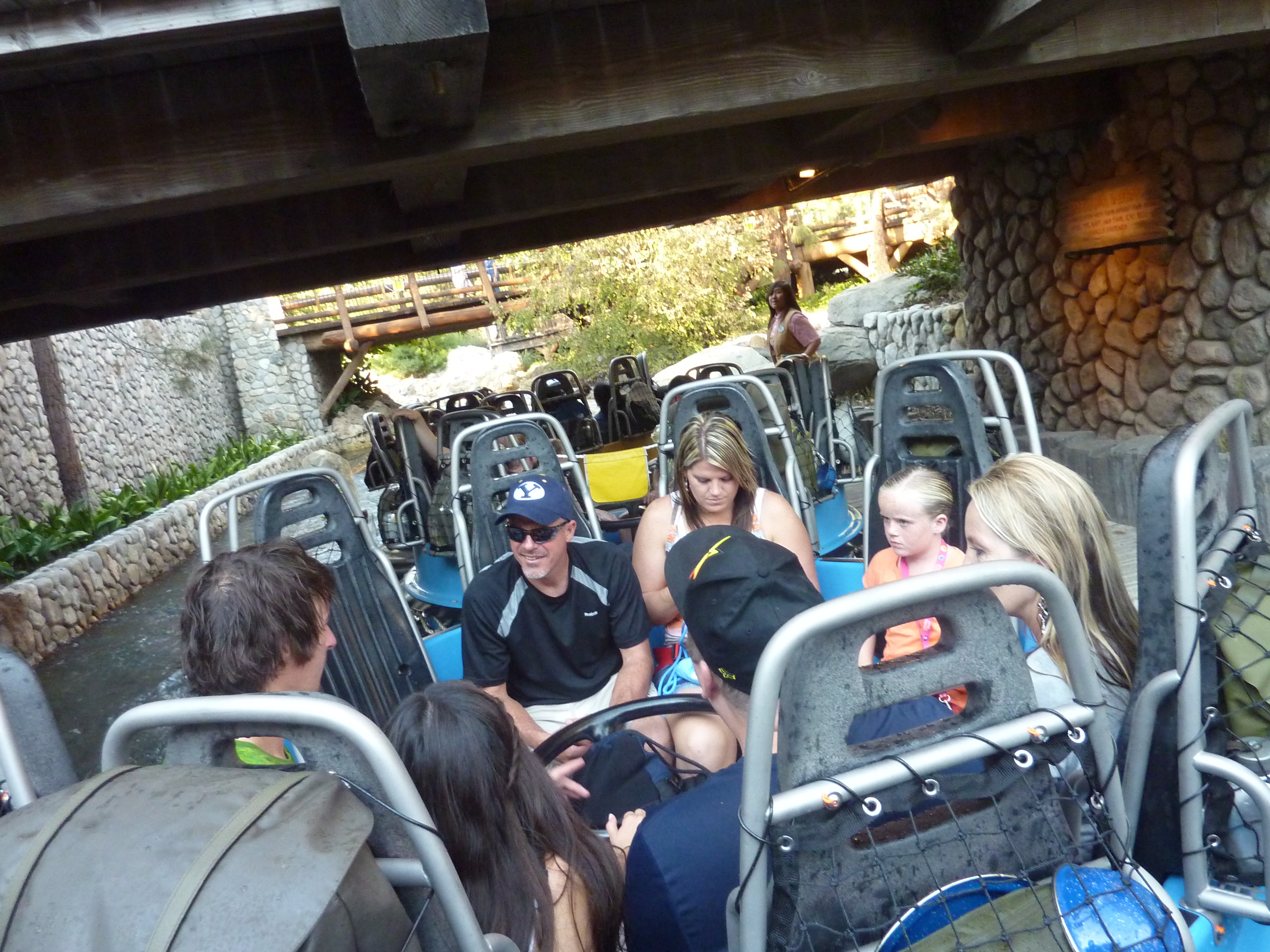 We hebben nog genoten van een waterfontein show, die toch niet in de schaduw kon staan van de Bellagio fonteinen. We wilden ook nog in de Goofy achtbaan, maar deze sloot vlak voordat wij er aankwamen. Er waren overigens opvallend veel attracties die dicht waren voor een paar uur of volledig voor renovatie of een ‘mooimaak’ beurt zoals ze dat hier noemen. Omdat we nog een Fast Pass hadden voor de Grizzly River zijn we daar naar teruggelopen. Binnen 5 minuten zaten we in het bakje. Dit keer met een stel uit Libanon of iets dergelijks. Deze waren bij elke druppel die ze over zich heen kregen al aan het miauwen. We werden iets minder nat dan de vorige keer, maar dat was ook niet zo raar want toen we bij het einde kwamen bleek dat er nog 5 boten lagen. We kwamen in de file, omdat de waterdruk weggevallen was. Dat betekende dat we ongeveer een kwartier in de boot moesten blijven en dat iedereen de attractie via een zijweg moest verlaten. hebben we dat ook een keer meegemaakt.