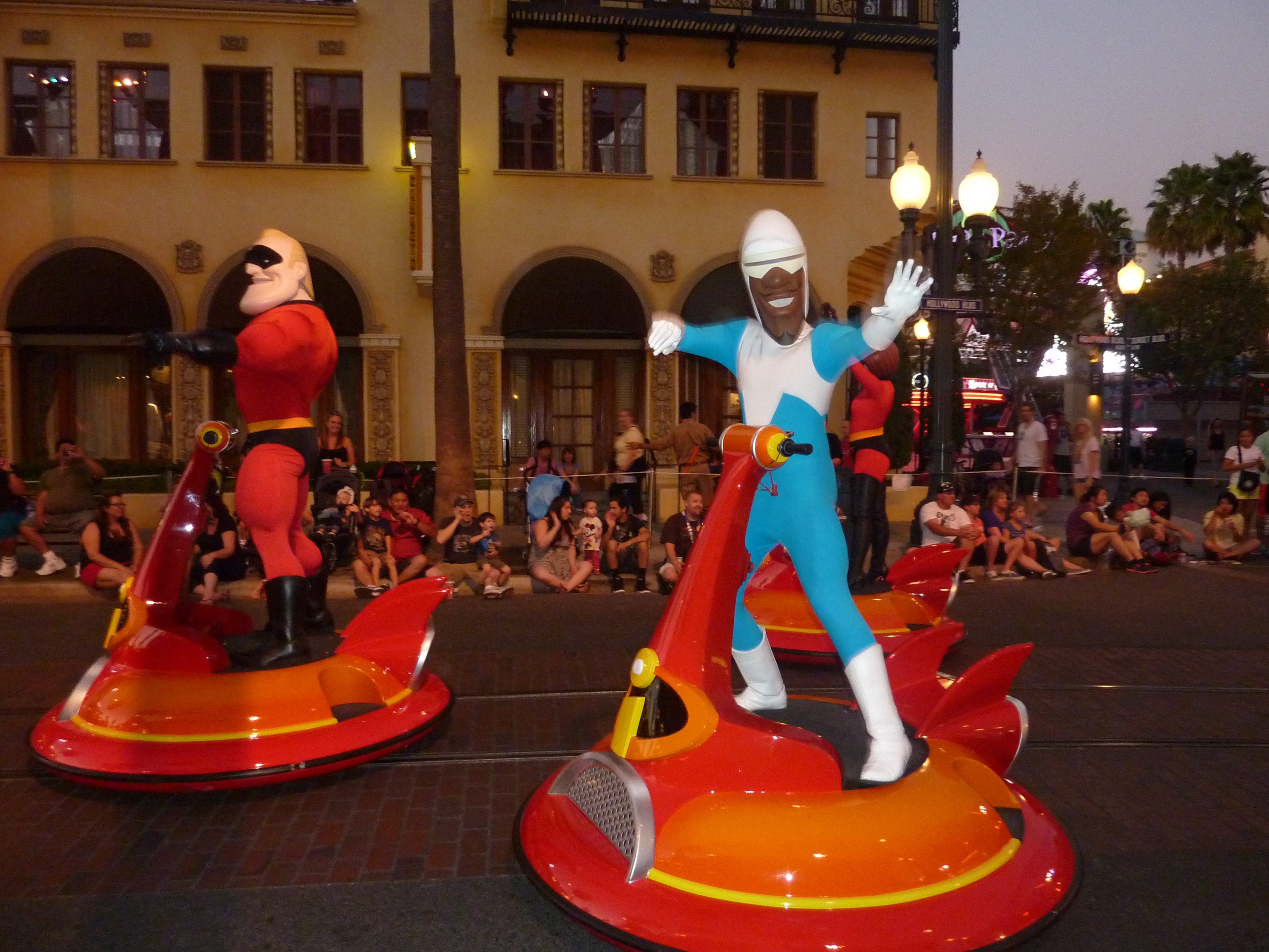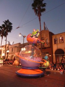 De laatste attractie die we gedaan hebben was het Twilight Zone Tower of Terror. Een bakje waar je met 20 man in zit en die in een twilight zone eigenlijk alleen omhoog en omlaag gaat. Je zit de hele tijd in een soort van lift en bovenin gaan de deuren op en kan je 2 seconden over het park uitkijken en 4 seconden later zit je weer 50 meter lager en kijk je in de kelder. Erg heftig om mee te maken en het gillen was dan ook niet van de lucht. Omdat het zo rustig was konden we direct weer naar binnen zonder een Fast Pass nodig te hebben. En dat hebben we dus gedaan. Daarna werd het donker en kwamen we erachter de de Disney Play Parade eraan kwam. We hebben ons aan de weg genesteld en daar kwamen alle Disney/Pixar figuren als Buzz Lightyear en Woody uit Toy Story, The Incredibles, Nemo, diverse karakters uit A Bug’s Life en nog vele anderen langs en kreeg Rob een aai over de bol van Sulley, 1 van de figuren uit Monsters Inc. Eline had het erg druk met foto’s maken.