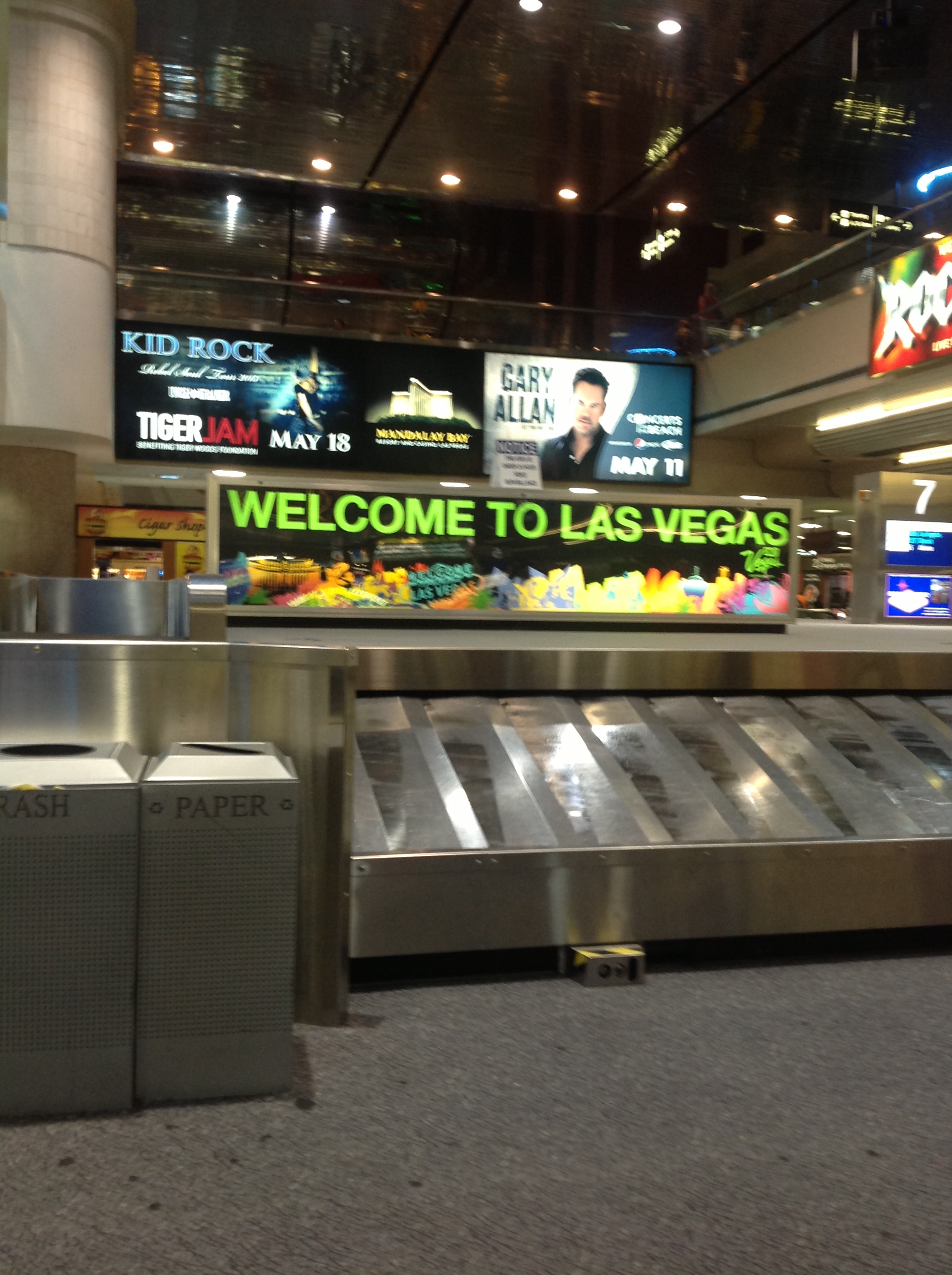 De telefoon van Rob was inmiddels leeg en dus kregen we niet door dat er een email van Delta was binnengekomen. In Atlanta hebben de koffers de aansluiting niet gehaald. Wij hadden zelf nog ongeveer 10 minuten speling, maar voor de koffers was dat net te weinig, of zoals ze bij Delta bagage claims vertelden, waarschijnlijk heeft de douane nog een extra routinecheck moeten uitvoeren. Hoe dan ook de koffers zouden met de volgende Delta vlucht in Vegas arriveren. En die vlucht kwam om 1912 aan. En aangezien onze koffers zo ongeveer als eerste in dat vliegtuig waren geladen kwamen ze dus ook als laatste uit het vliegtuig. En hebben we nog een uurtje bij de bagageband doorgebracht. We hebben daar in da automaten toch maar niet gegokt, daar hebben we de komende dagen nog meer dan genoeg tijd voor.