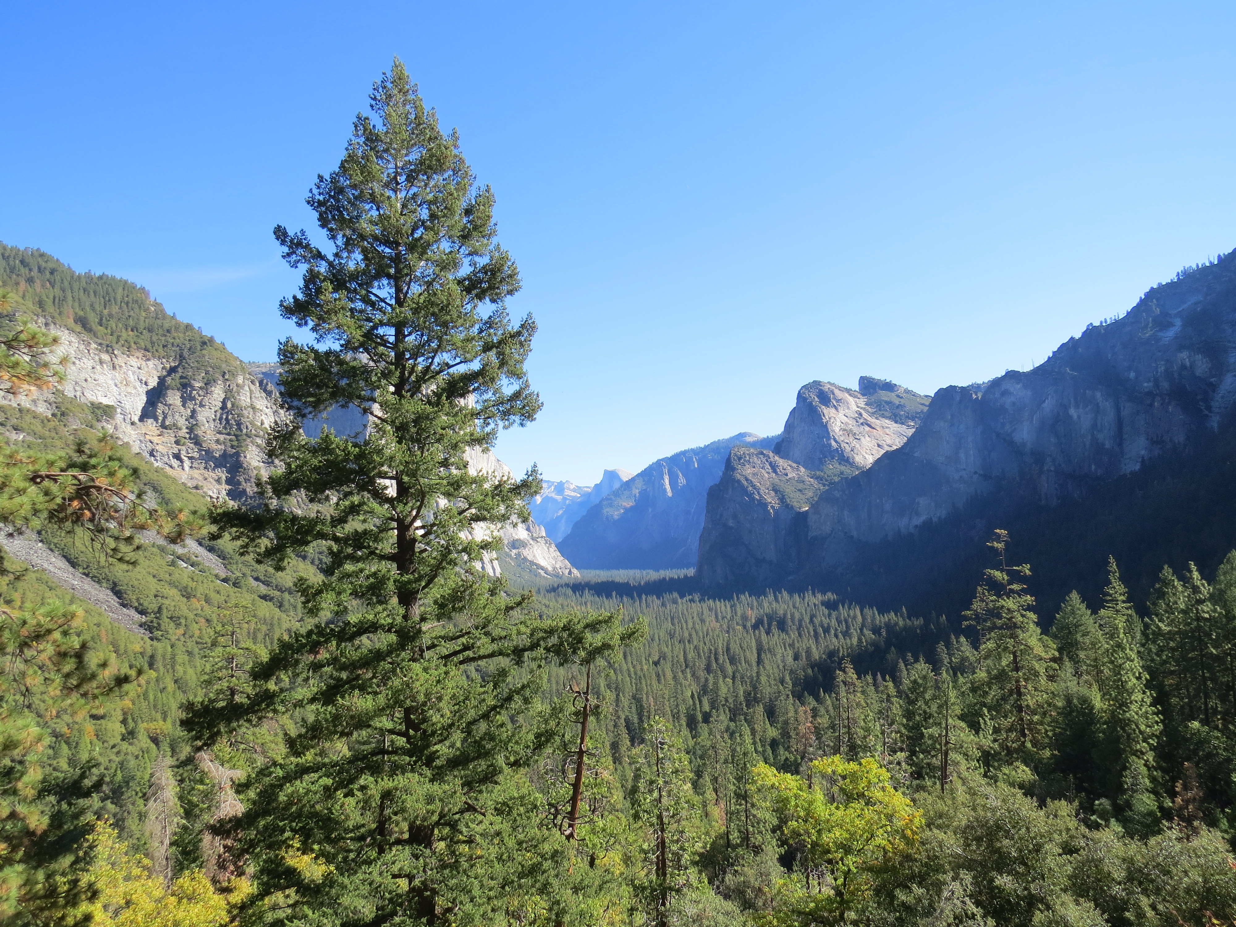 We beginnen bij Tunnel View, een uitkijkpunt op onder andere El Capitan, de granieten rots waar veel bergbeklimmers voor naar Yosemite komen.