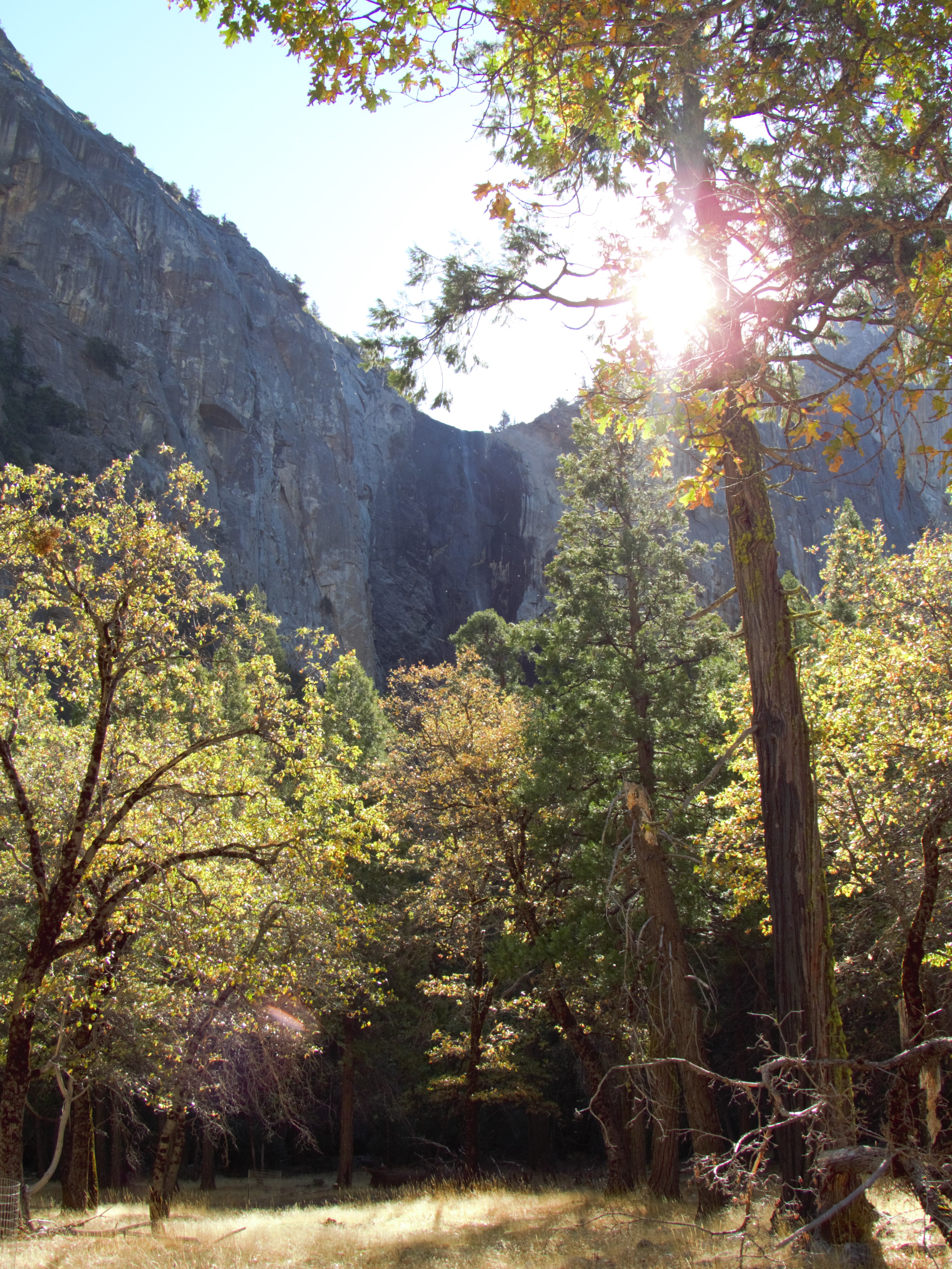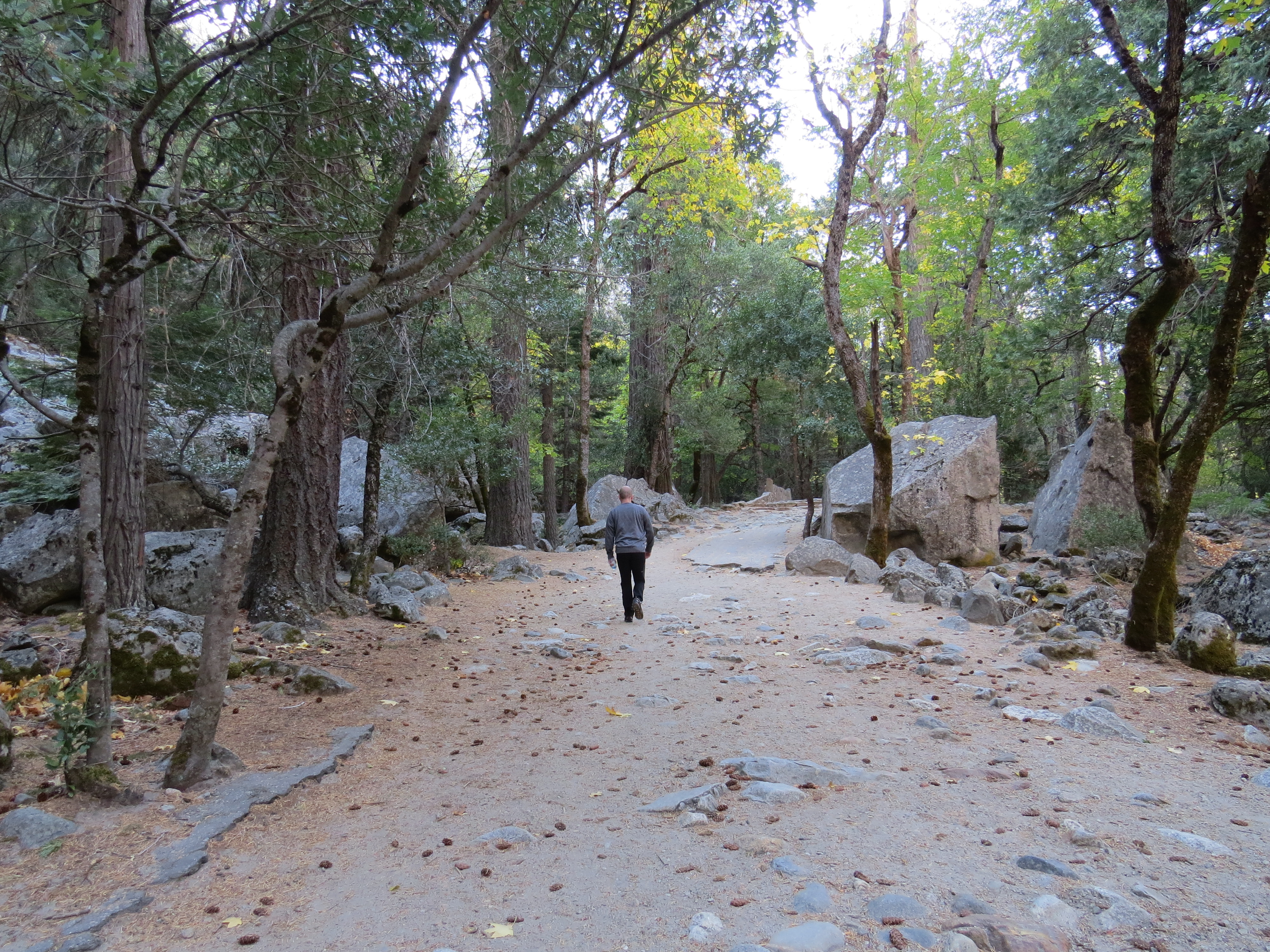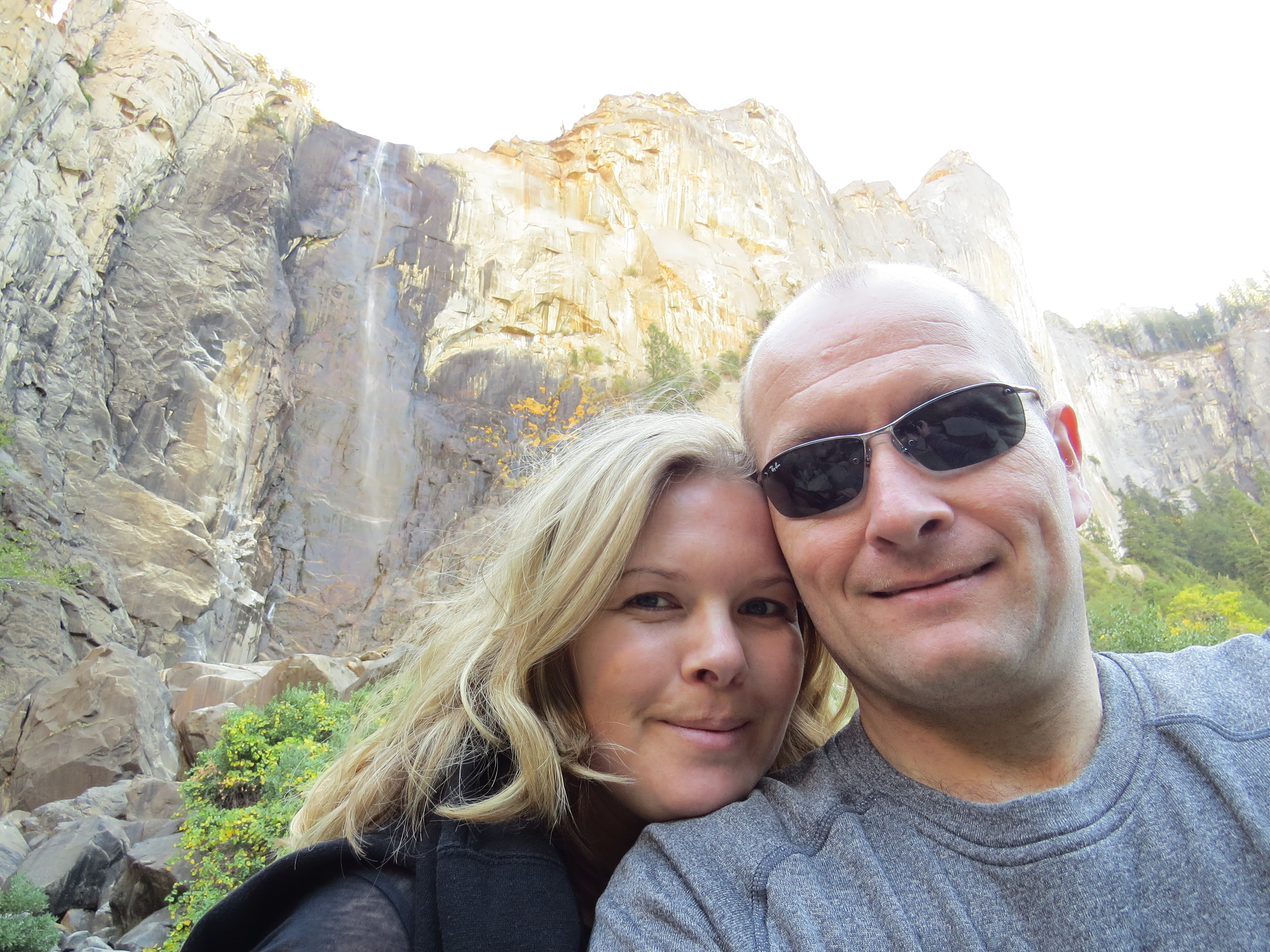 Vanaf de parkeerplaats wandelen we een kleine 2 miles naar Bridalveil Fall. Deze waterval is bijna opgedroogd, maar er is nog een stroompje water te zien dat vanaf de rots naar beneden komt. Bridalveil (bruidssluier) is de romantische benaming van deze waterval. De oorspronkelijke bewoners van Yosemite, de Ahwahnechee indianen noemden de waterval Pohono, volgens de legende omdat ze geloofden dat er een boze geest bezit had genomen van de waterval.