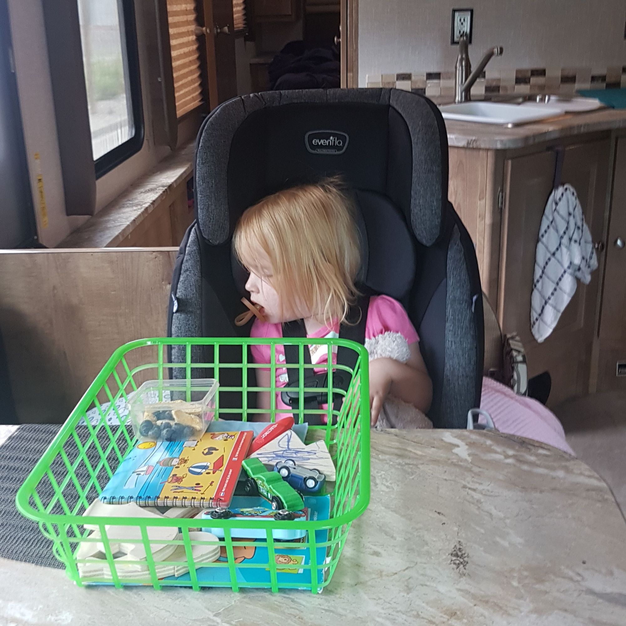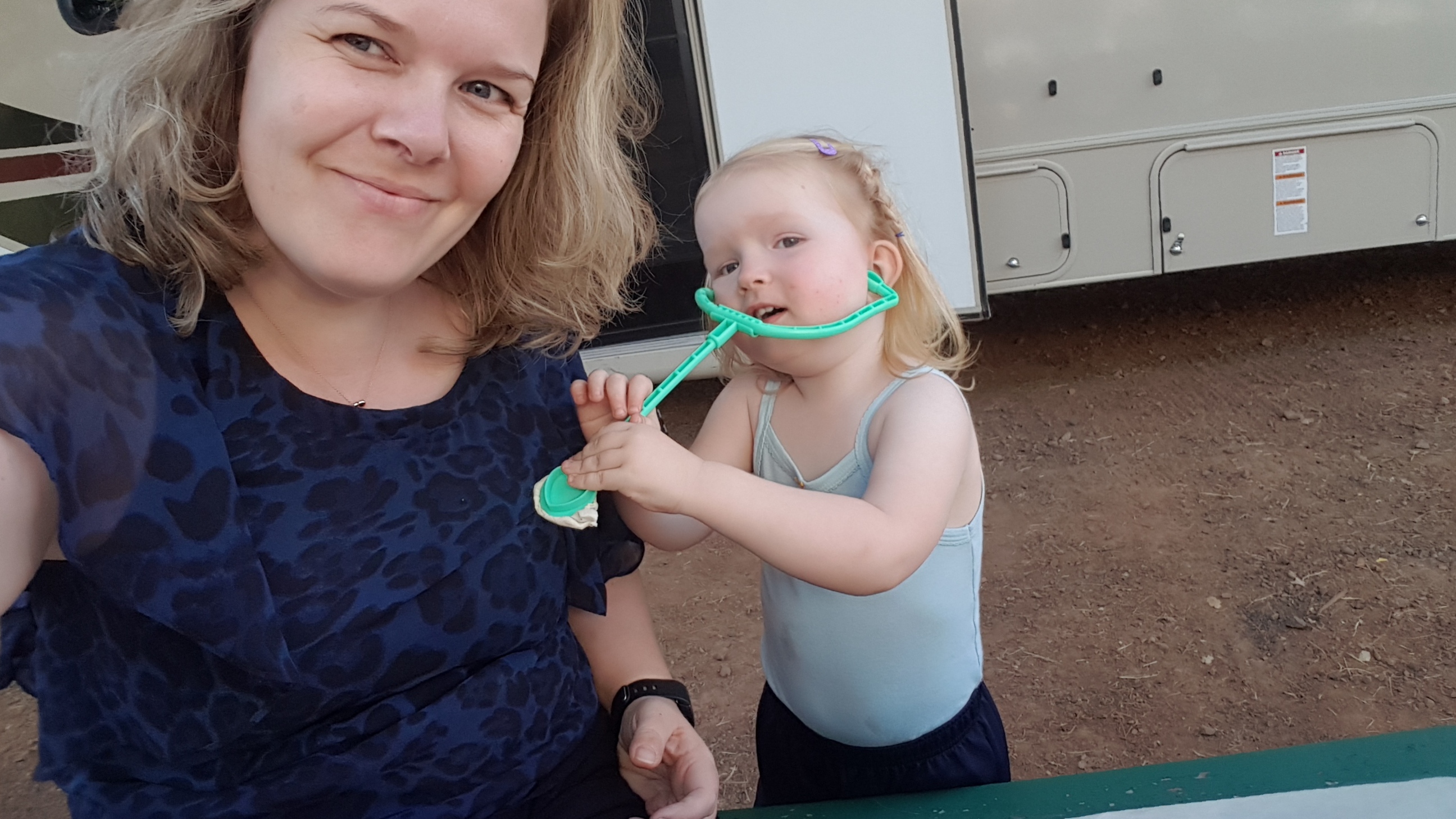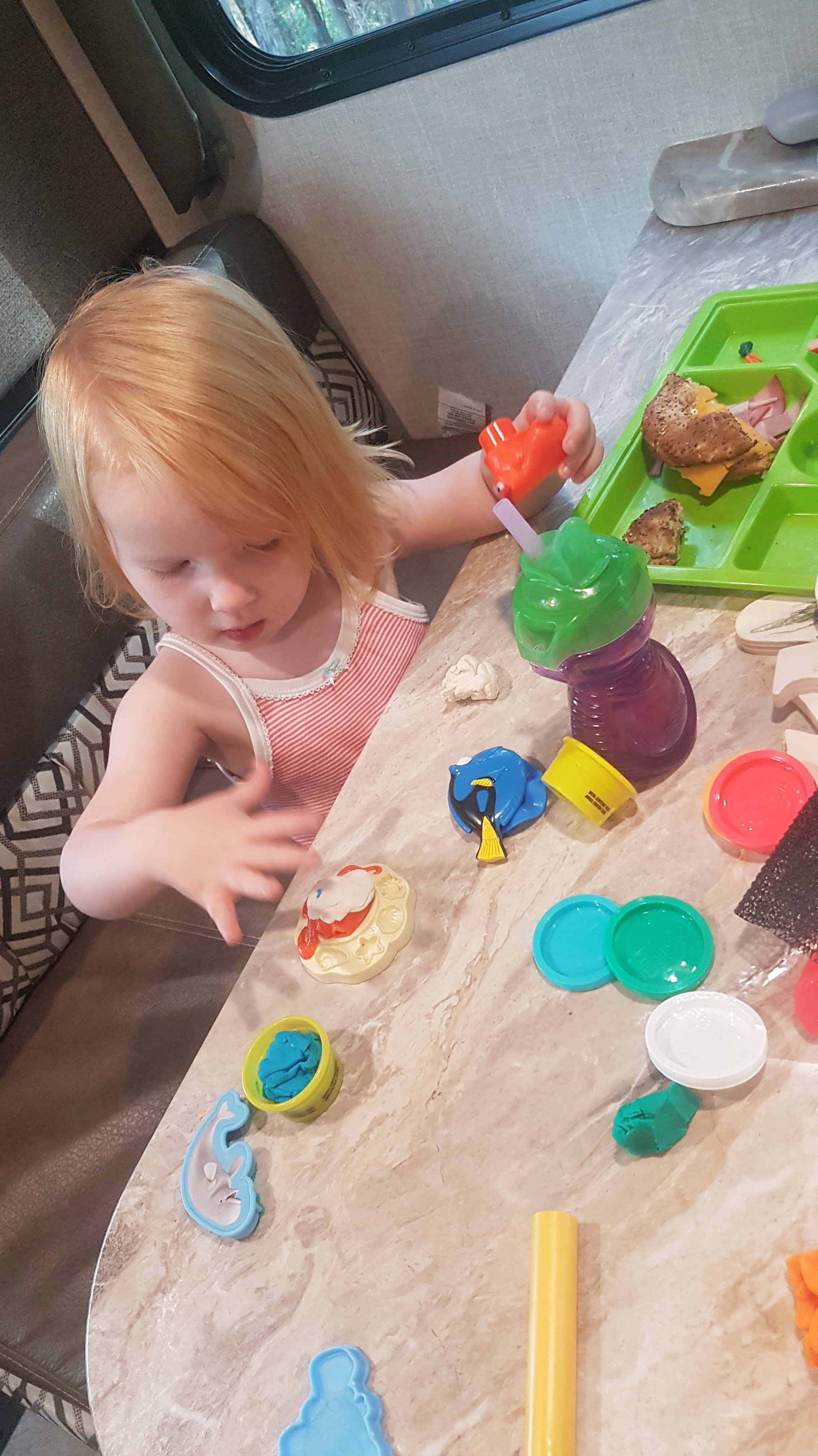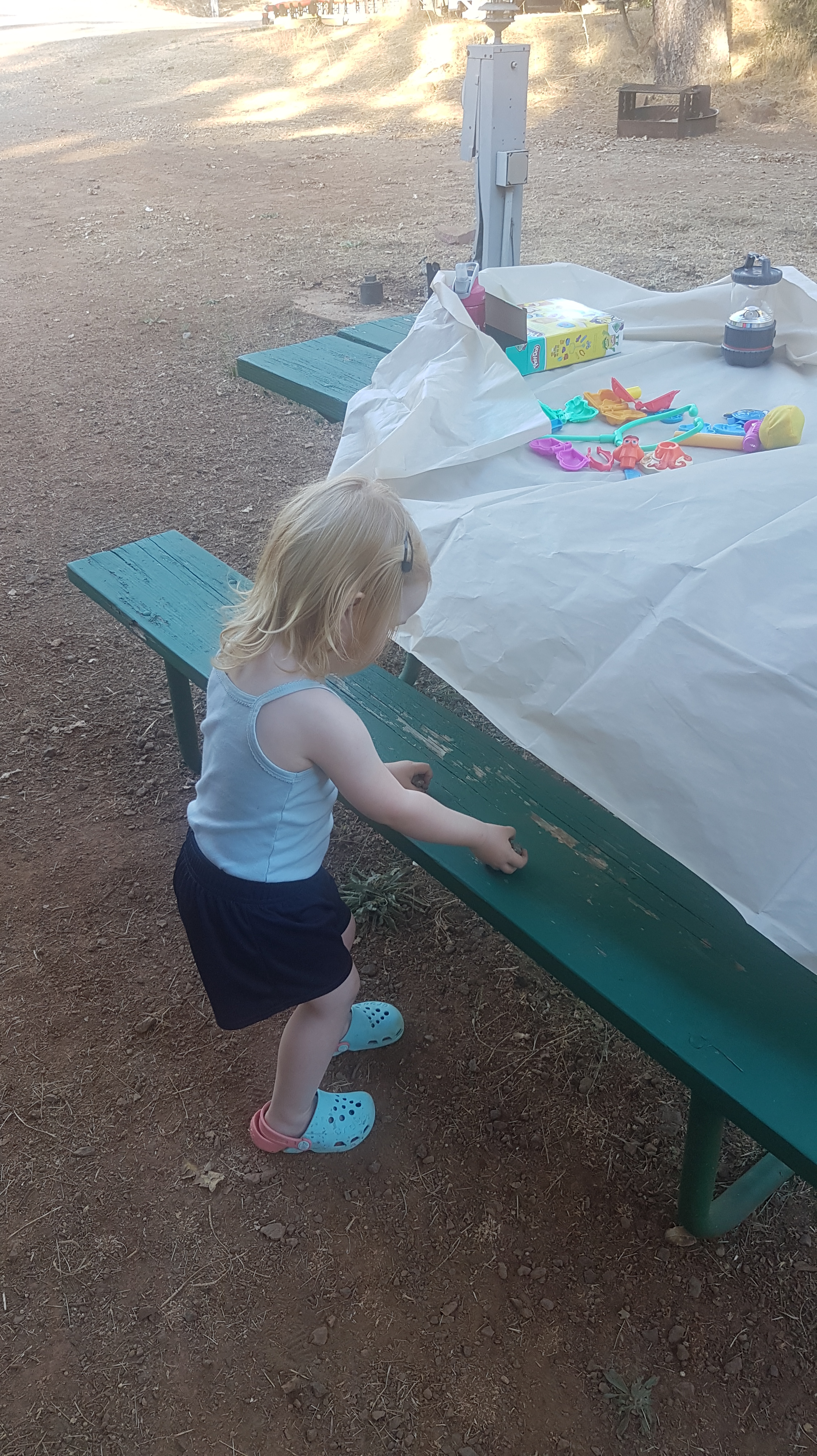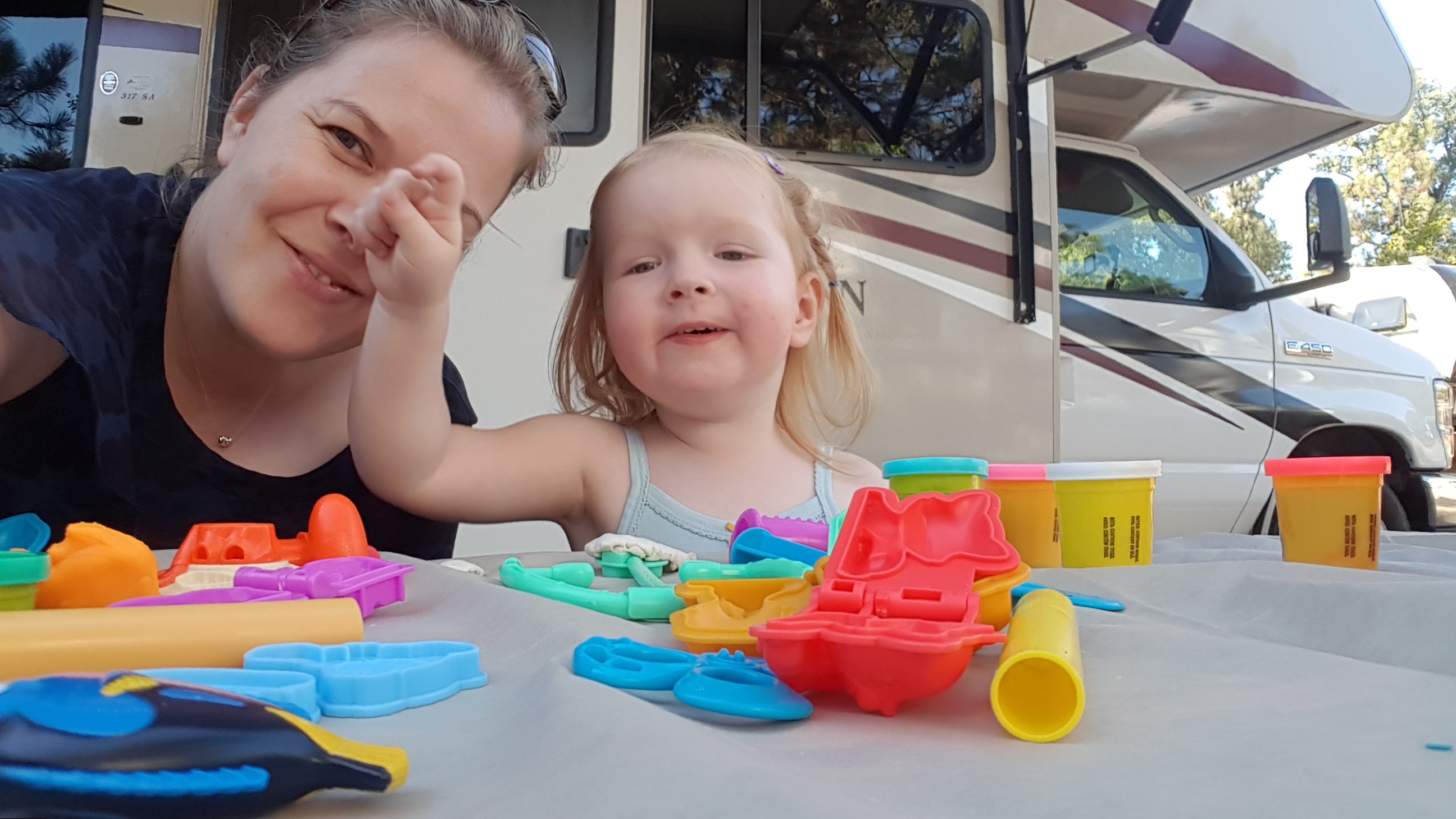 Rob is uiteraard als eerste wakker, hij start de ochtend met een ontbijtje buiten en gaat daarna hardlopen naar het meer vlakbij, wat we hebben gezien op de rit naar de campground. Een hele steile daling en klim, 4 kilometer in een halfuur met een hoogteverschil van 170 meter. Eline en Lizzy starten de dag rustig op, beetje kleien, ontbijtje erbij. Daarna nog wel de camper even schoonmaken, want je loopt veel troep naar binnen en het is natuurlijk wel je leefruimte. Gelukkig is het gewoon ieniemini vergeleken bij je eigen huis, dus je bent zo klaar haha.