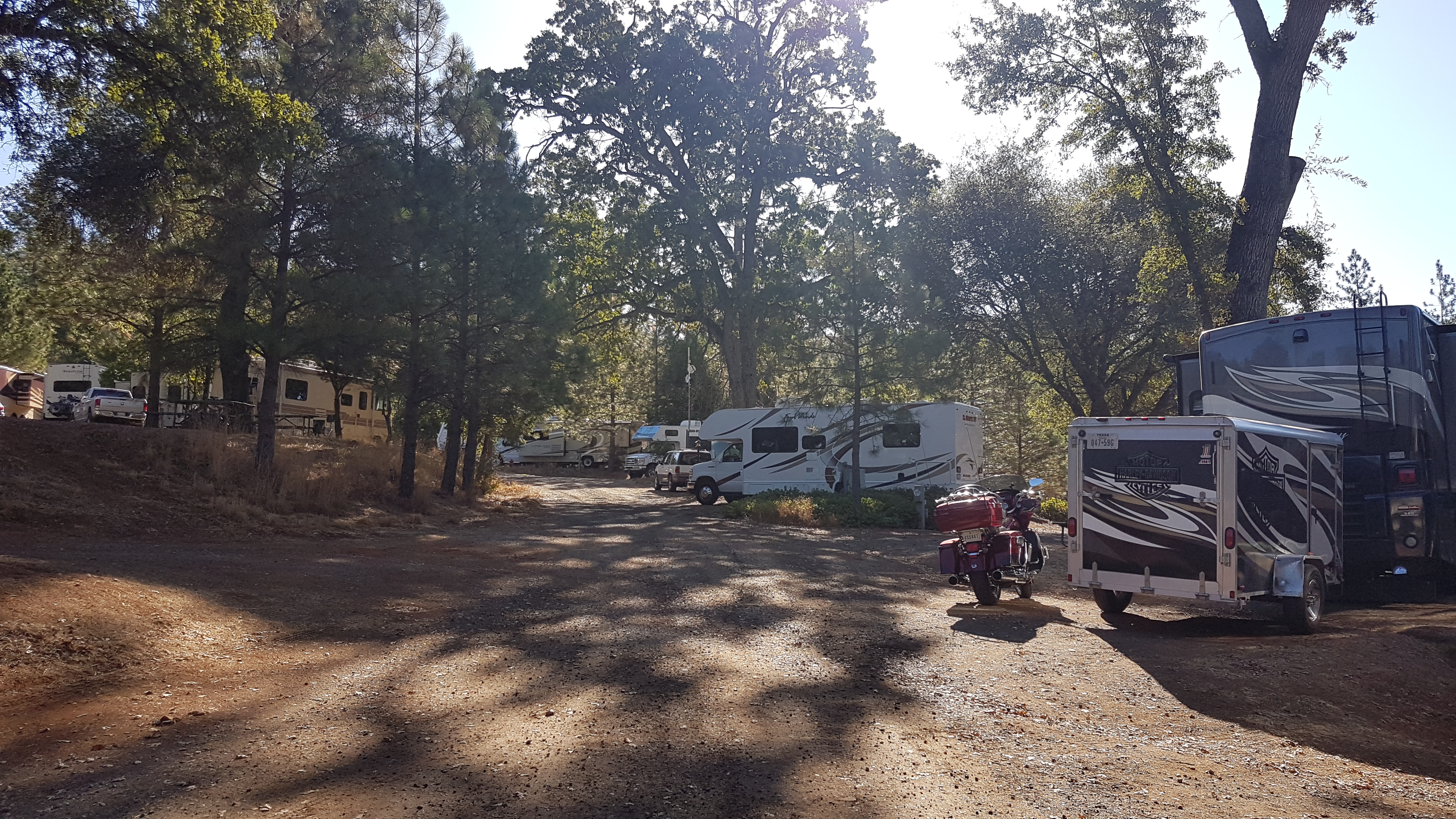 We vragen ons op het eind wel af of we de juiste weg gaan naar de camping, het wordt allemaal wat smaller en we zien niet echt iets wat lijkt op de plaatjes online. Rob had wel een bordje camping deze kant op gezien en ineens doemt na een bocht het bord van Yosemite Pines RV Resort voor ons op…. Hmm de eerste indruk is even anders dan we verwacht hadden, benieuwd hoe het op het park zelf is.