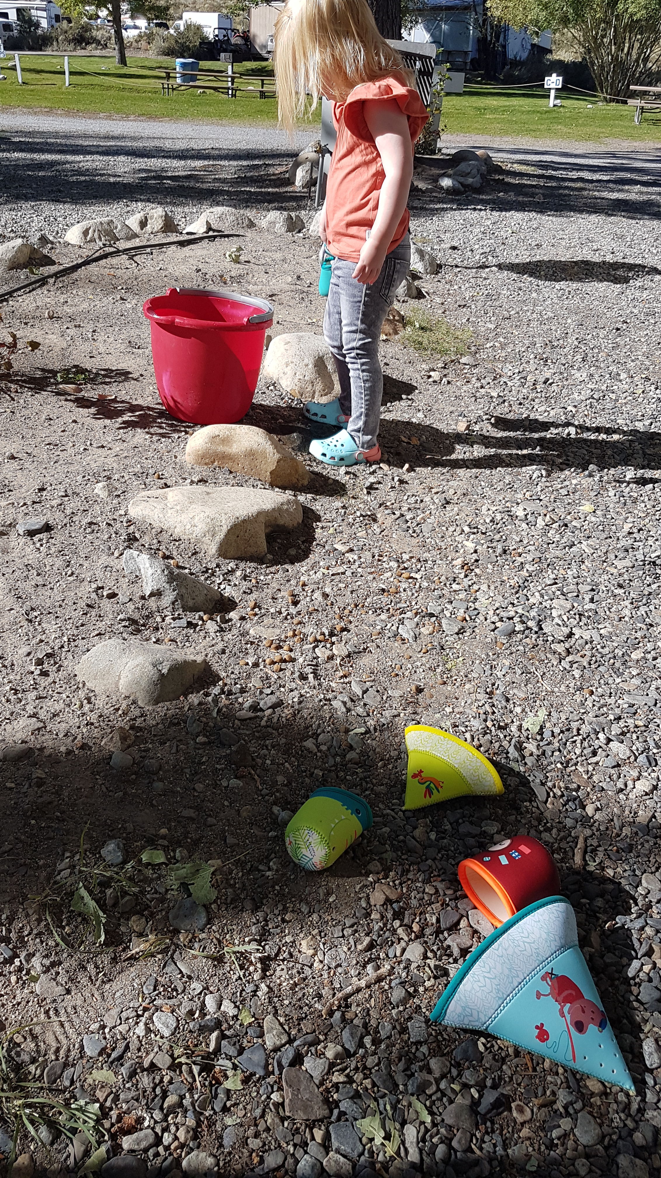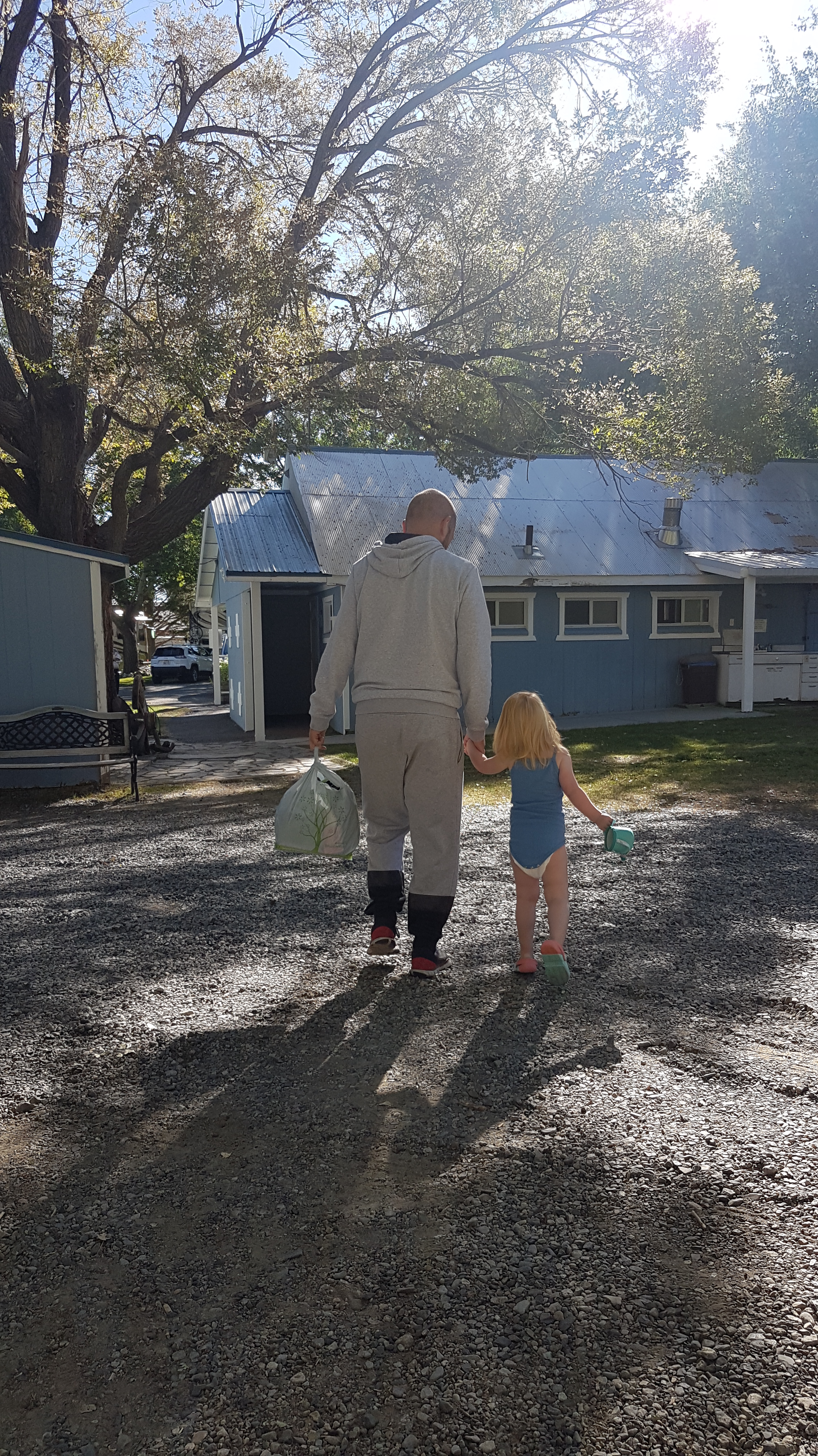 We wandelen terug naar de hoofdstraat en gaan naar Bodie Mike’s BBQ restaurant om lekker te gaan eten. Rob smult van spareribs en Lizzy van een hamburger, de zalm van Eline is droog en daardoor wat minder geslaagd. Na het eten haalt Rob nog even koffie bij Latte Da, een zaakje wat leuk hippie aandoet. Eline zit even lekker op een schommelbank en Lizzy vermaakt zich met kussens verplaatsen en af en toe de schommelbank duwen. Terug op de camping worden er nog wat stenen gezocht en jawel hoor… die kun je prima kwijt in je badpak. Wat een heerlijke grapjas is onze dochter ook en wat een heerlijke dag hebben we gehad.