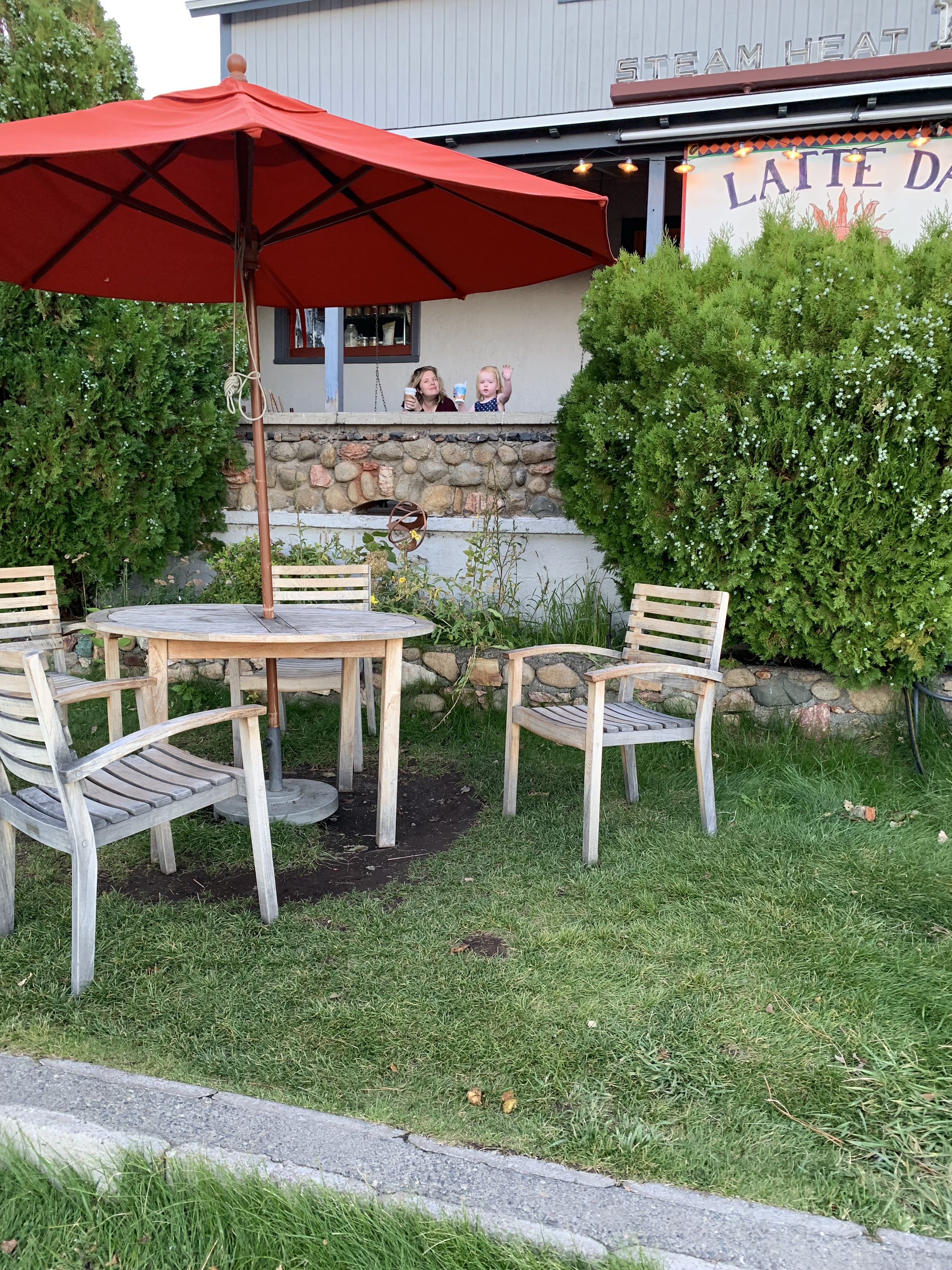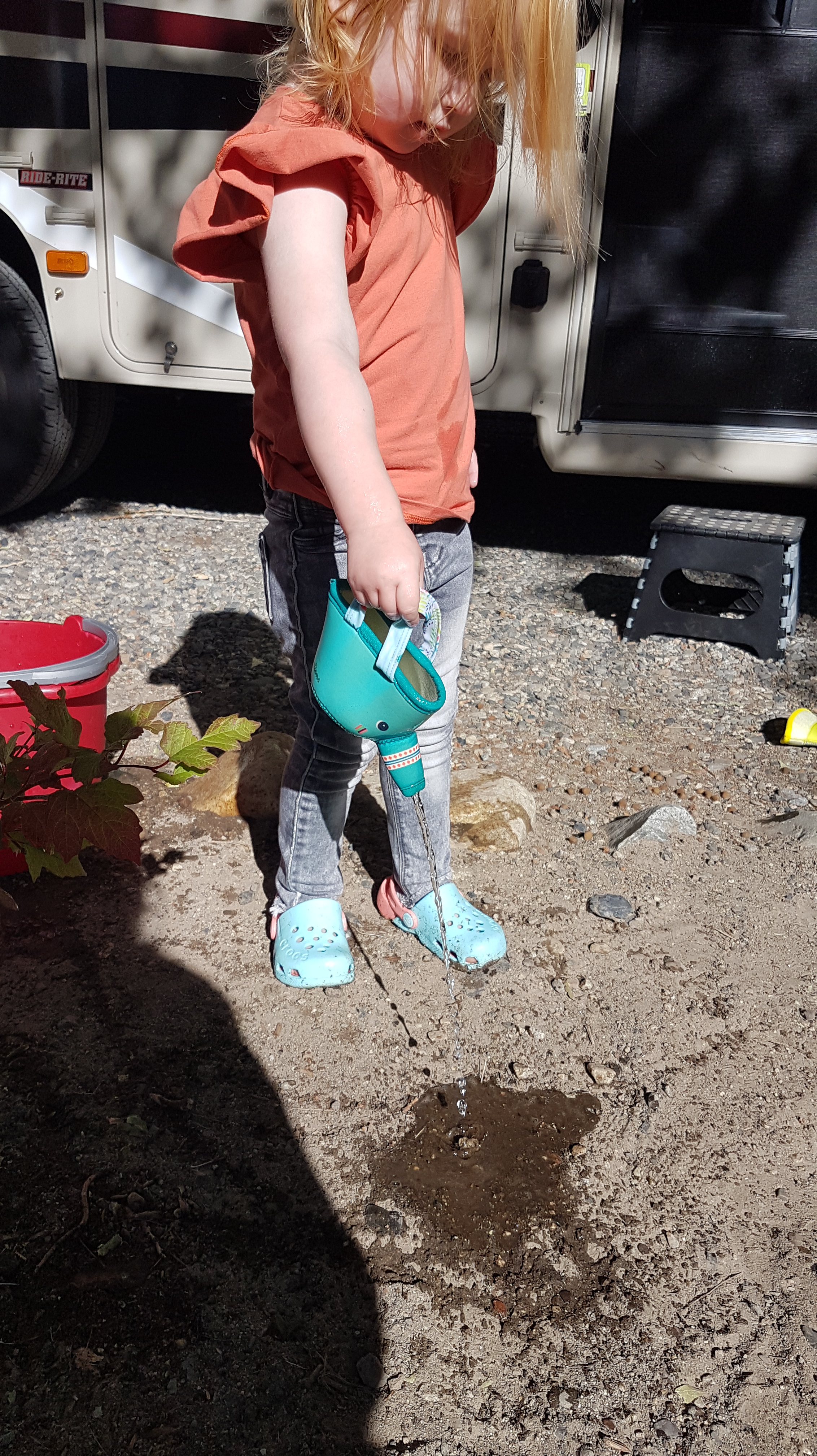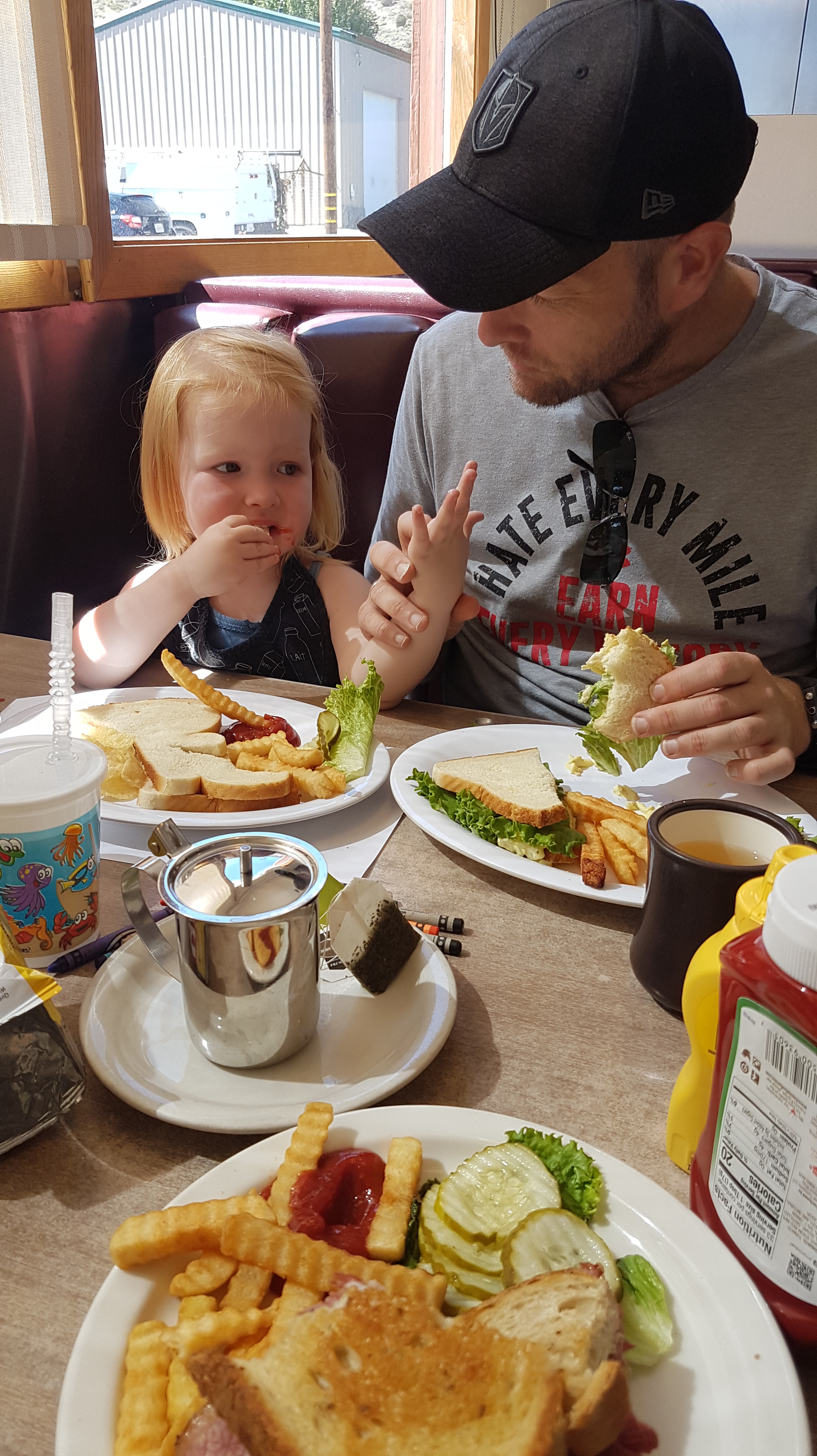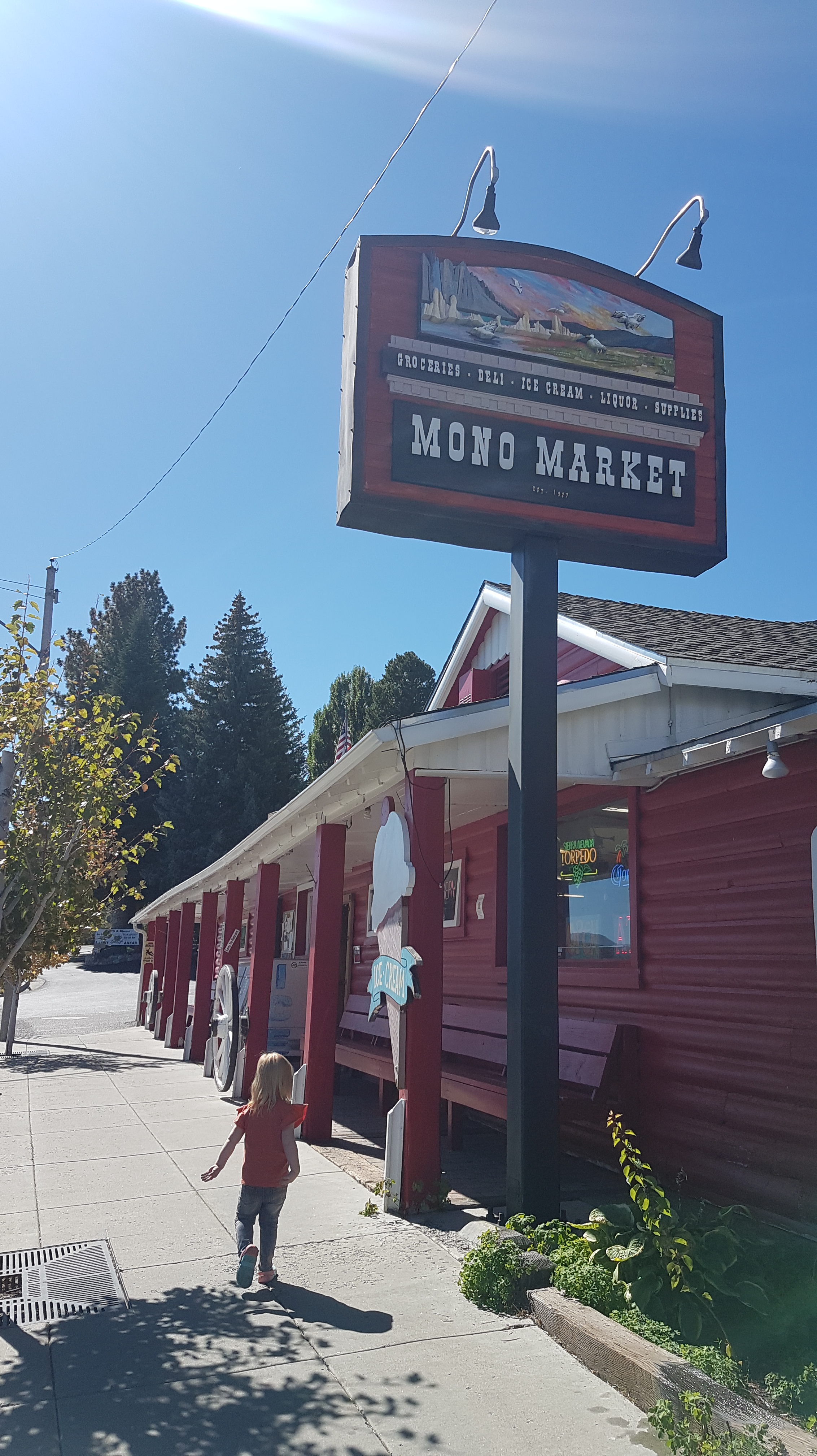 Iets voor elven lopen we de camping af, een klein stukje lopen en je komt in een ieniemienie centrum. Als eerste bezoeken we de supermarkt, die verrassend compleet is, terwijl hij maar heel klein is. Het is een strijd om Lizzy rustig bij ons te houden, die rent het liefst als een malle door de smalle gangpaden. Vooral Rob krijgt het er een beetje benauwd van omdat er nogal wat glazen potjes staan her en der. Uiteindelijk scoren we o.a. rijstwafels, pakjes en zakjes kruiden voor o.a. pasta, jus en nasi (nog niet kunnen vinden in de Walmart) en Rob vind een heerlijke bbqsaus. Het is een beetje veel om mee te sjouwen, dus Rob brengt het even snel terug naar de camper. Lizzy had schepijs in de winkel gezien en wilde niet wachten tot na de lunch. Een compromis was een iets kleiner ijsje uit de vriezer die voor in de winkel staat. Lekker smullen samen met mama op een bankje in de zon voor de winkel terwijl we op papa wachten. Geen straf, want het is leuk mensen kijken ook, haha. Het loopt af en aan met locals die lunch komen halen, maar ook zien we veel toeristen. De ene na de andere RV en fifth wheeler stopt voor bijvoorbeeld wat bananen en brood.