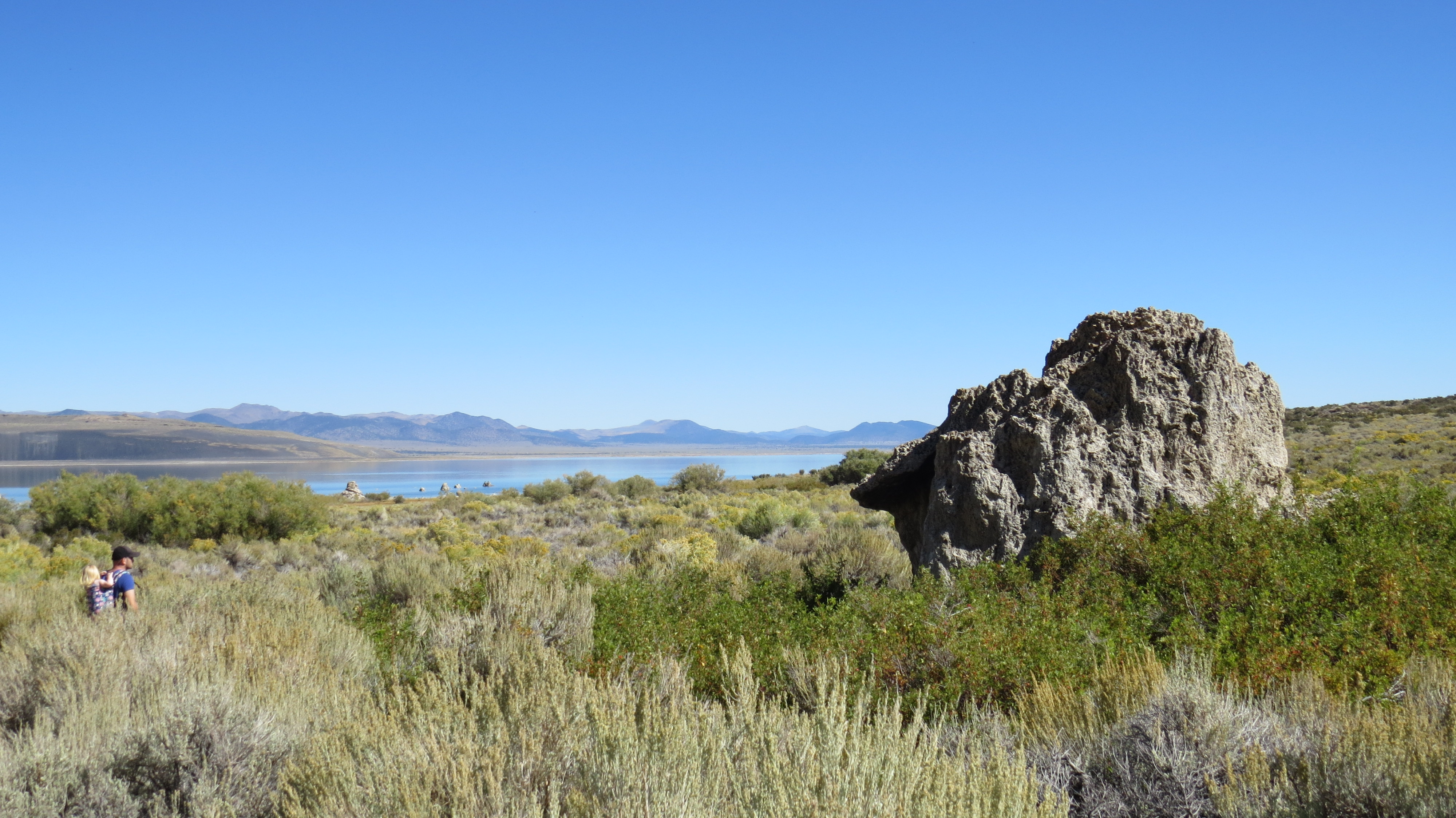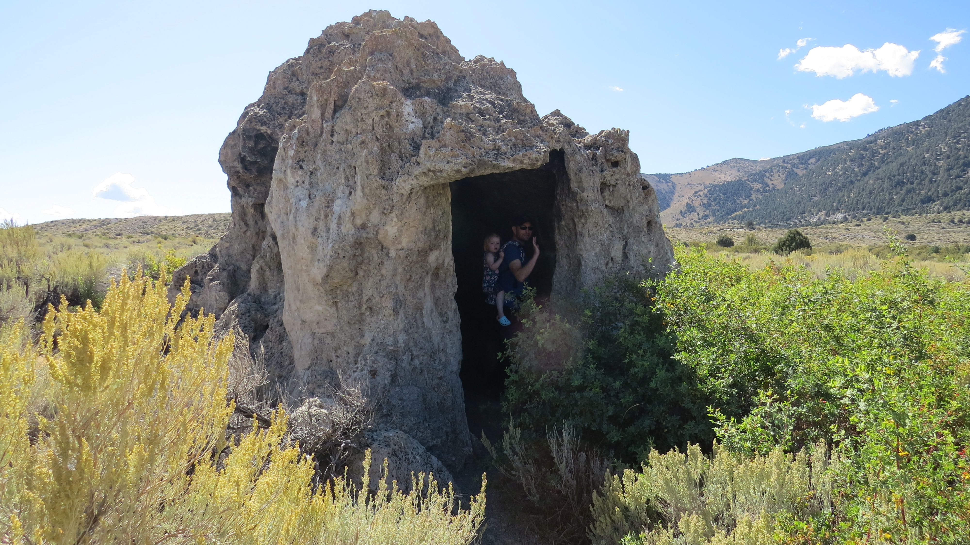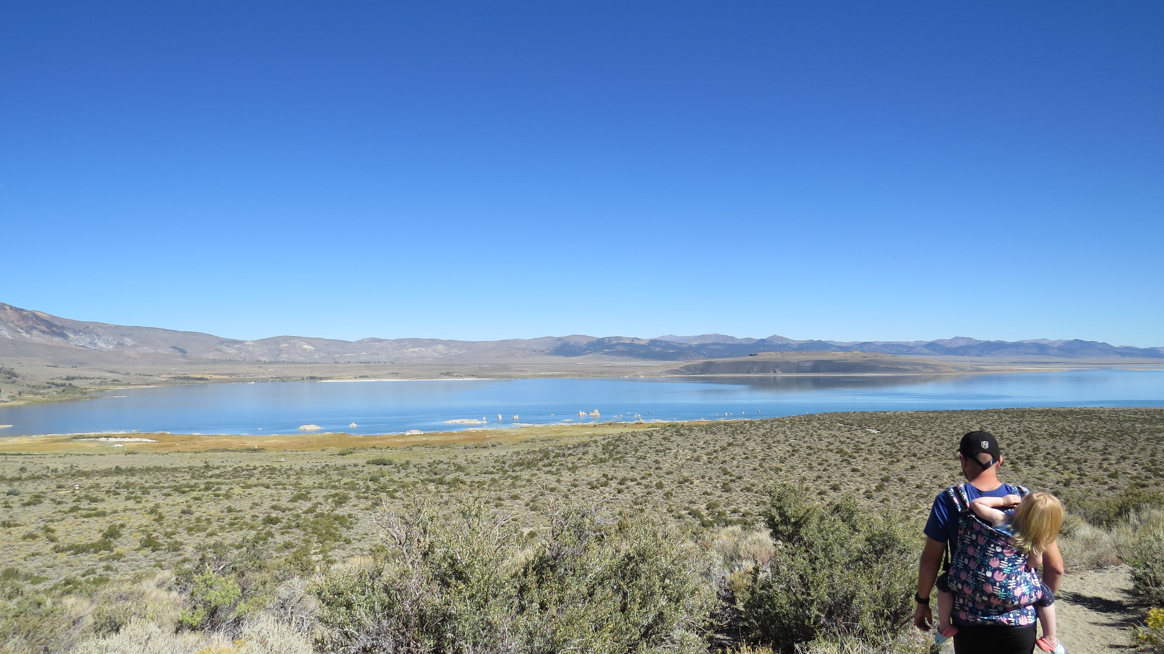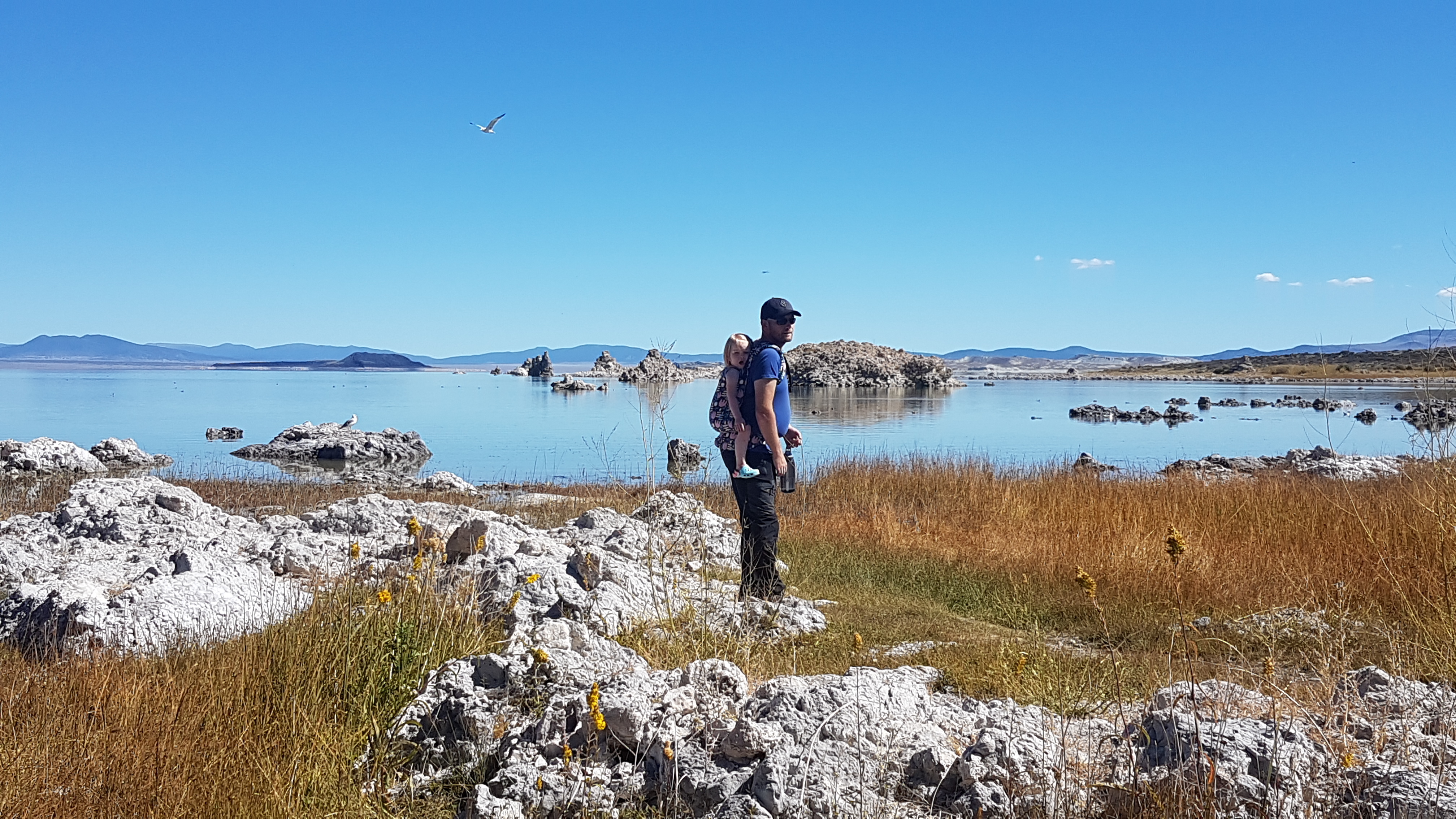 Daarna is het tijd voor het korte ritje naar het Visitor Center van Mono Basin Scenic Area. We pakken onze rugzak in, Lizzy gaat bij papa in de Tula en zo beginnen we aan de wandeling. Het pad is goed te doen, eerst zanderig en daarna vooral rotsachtig. De heenreis is het naar beneden, dus dat is het makkelijke deel. En bovendien is het uitzicht op Mono Lake geweldig. In het meer zijn vele Tufa torens te zien (kalktufsteenformaties), ze worden ook wel de zoutpilaren genoemd. Mono Lake is ongeveer 2,5 keer zo zout als de zee en op de Tufa’s dicht bij het water zie je de zoutkristallen dus ook echt liggen. Tijdens de wandeling komen we Icebox Tufa tegen, een Tufa die volledig op het droge ligt waar het zout niet op te zien is, het lijkt gewoon een rots. Hij doet zijn naam eer aan, want binnenin is het heerlijk koel terwijl de temperatuur behoorlijk aan het oplopen is.