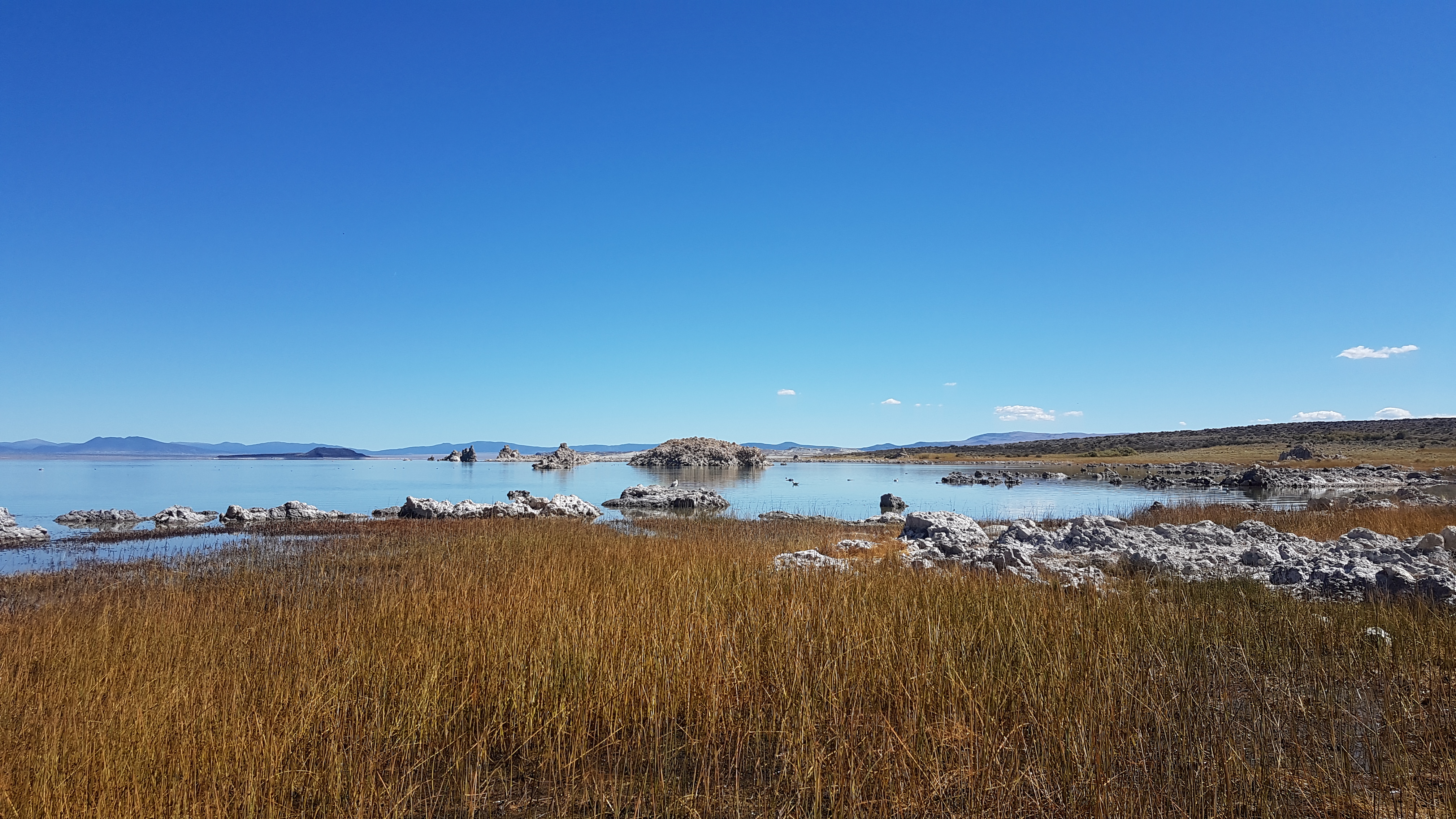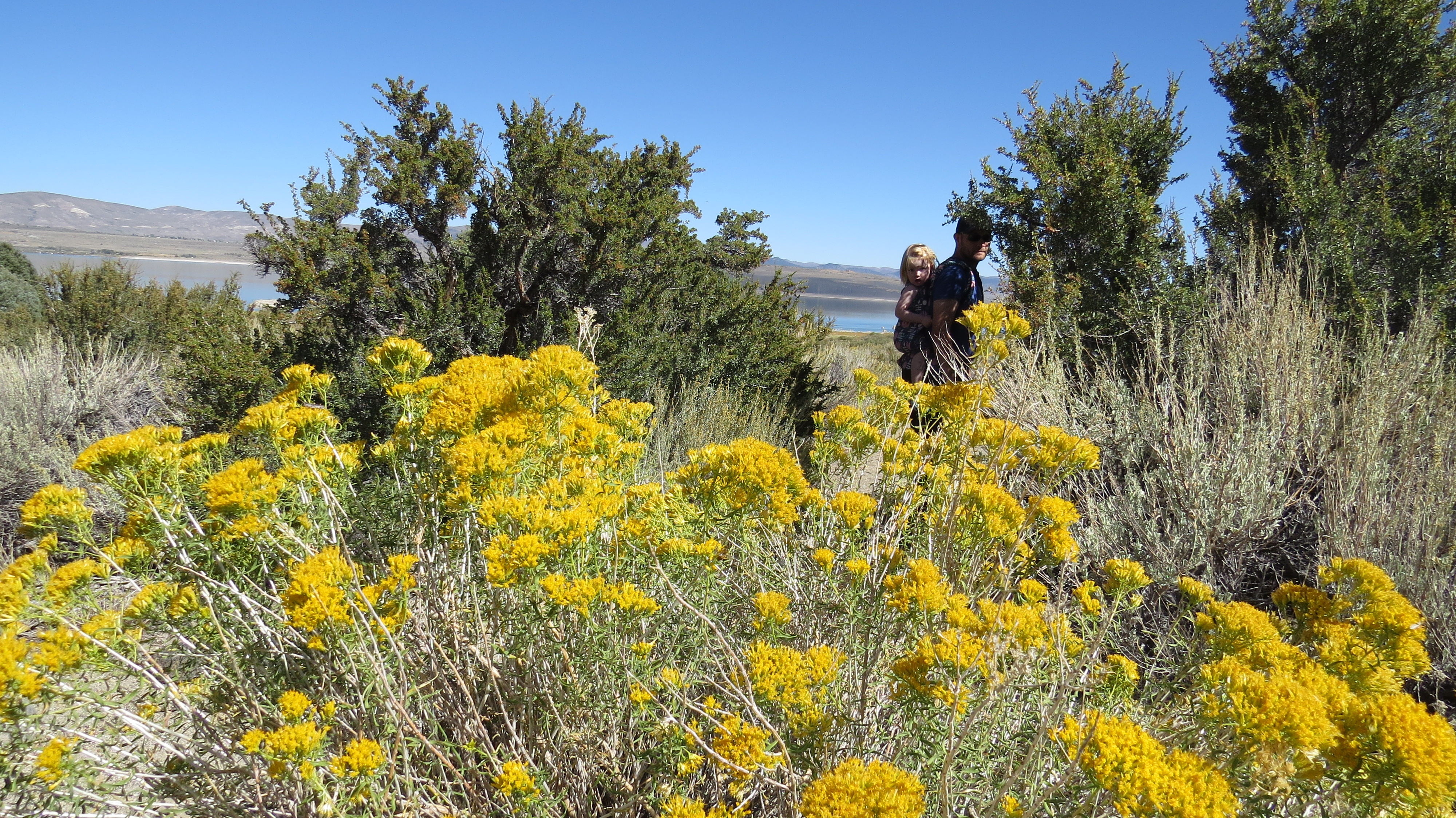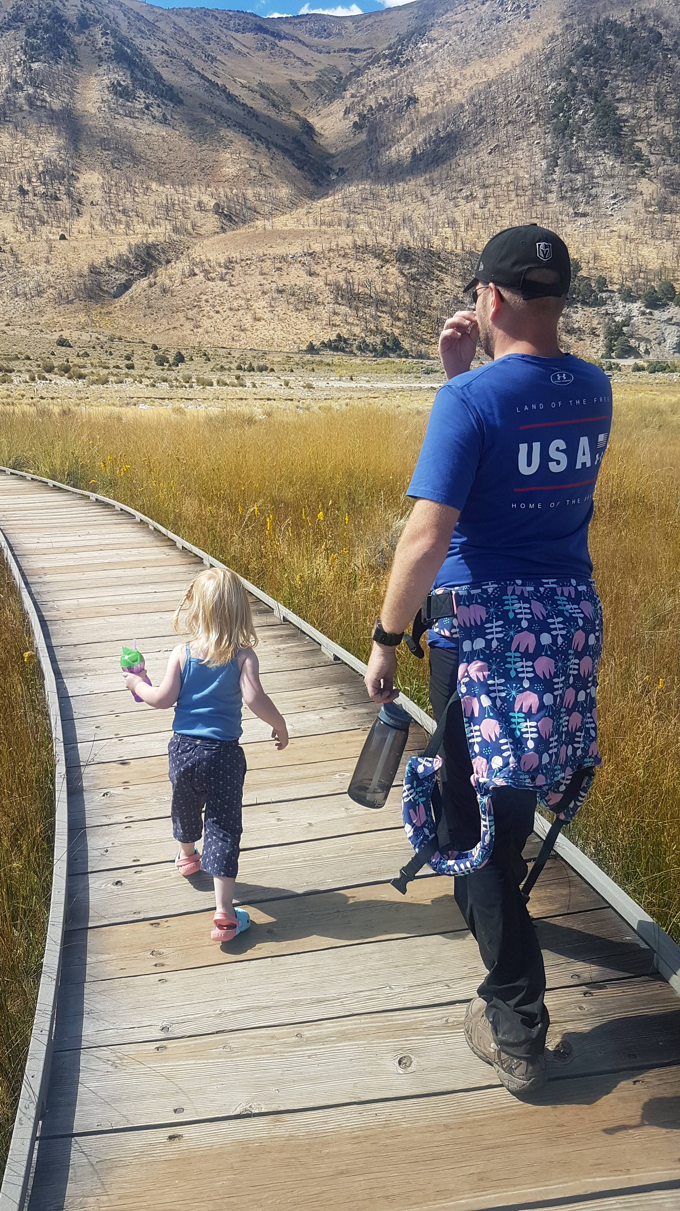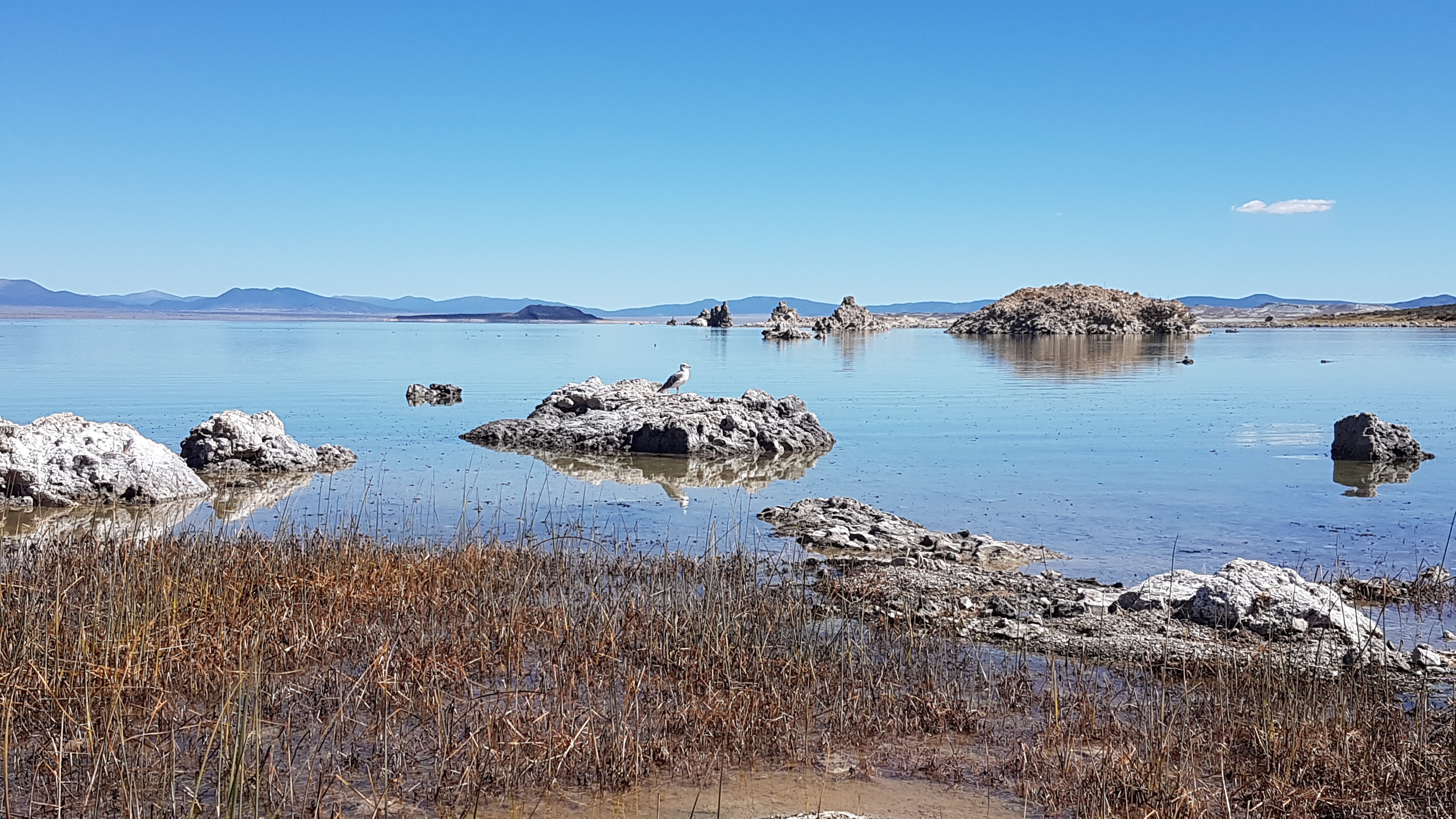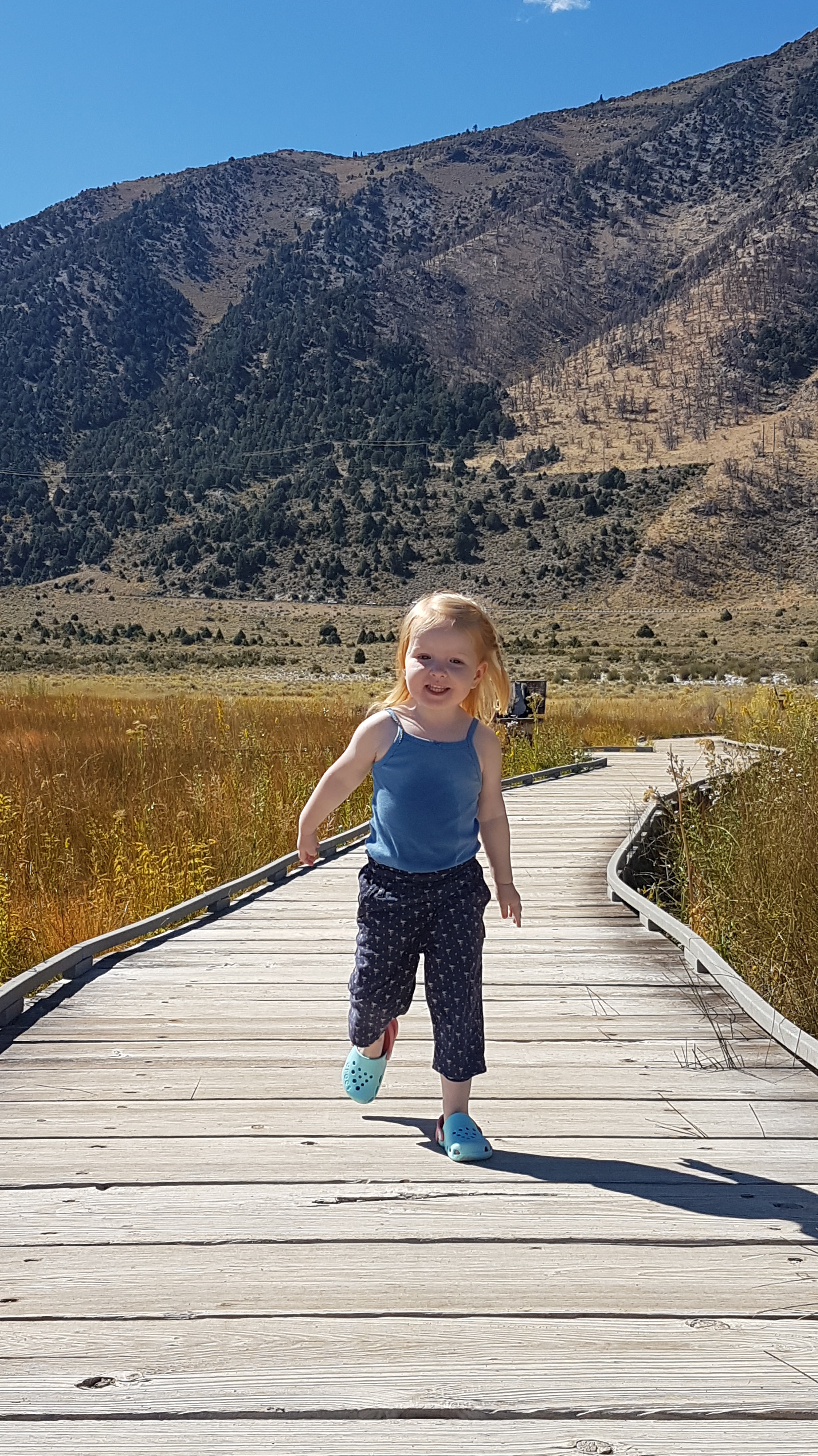 Daarna is het tijd voor het korte ritje naar het Visitor Center van Mono Basin Scenic Area. We pakken onze rugzak in, Lizzy gaat bij papa in de Tula en zo beginnen we aan de wandeling. Het pad is goed te doen, eerst zanderig en daarna vooral rotsachtig. De heenreis is het naar beneden, dus dat is het makkelijke deel. En bovendien is het uitzicht op Mono Lake geweldig. In het meer zijn vele Tufa torens te zien (kalktufsteenformaties), ze worden ook wel de zoutpilaren genoemd. Mono Lake is ongeveer 2,5 keer zo zout als de zee en op de Tufa’s dicht bij het water zie je de zoutkristallen dus ook echt liggen. Tijdens de wandeling komen we Icebox Tufa tegen, een Tufa die volledig op het droge ligt waar het zout niet op te zien is, het lijkt gewoon een rots. Hij doet zijn naam eer aan, want binnenin is het heerlijk koel terwijl de temperatuur behoorlijk aan het oplopen is.
