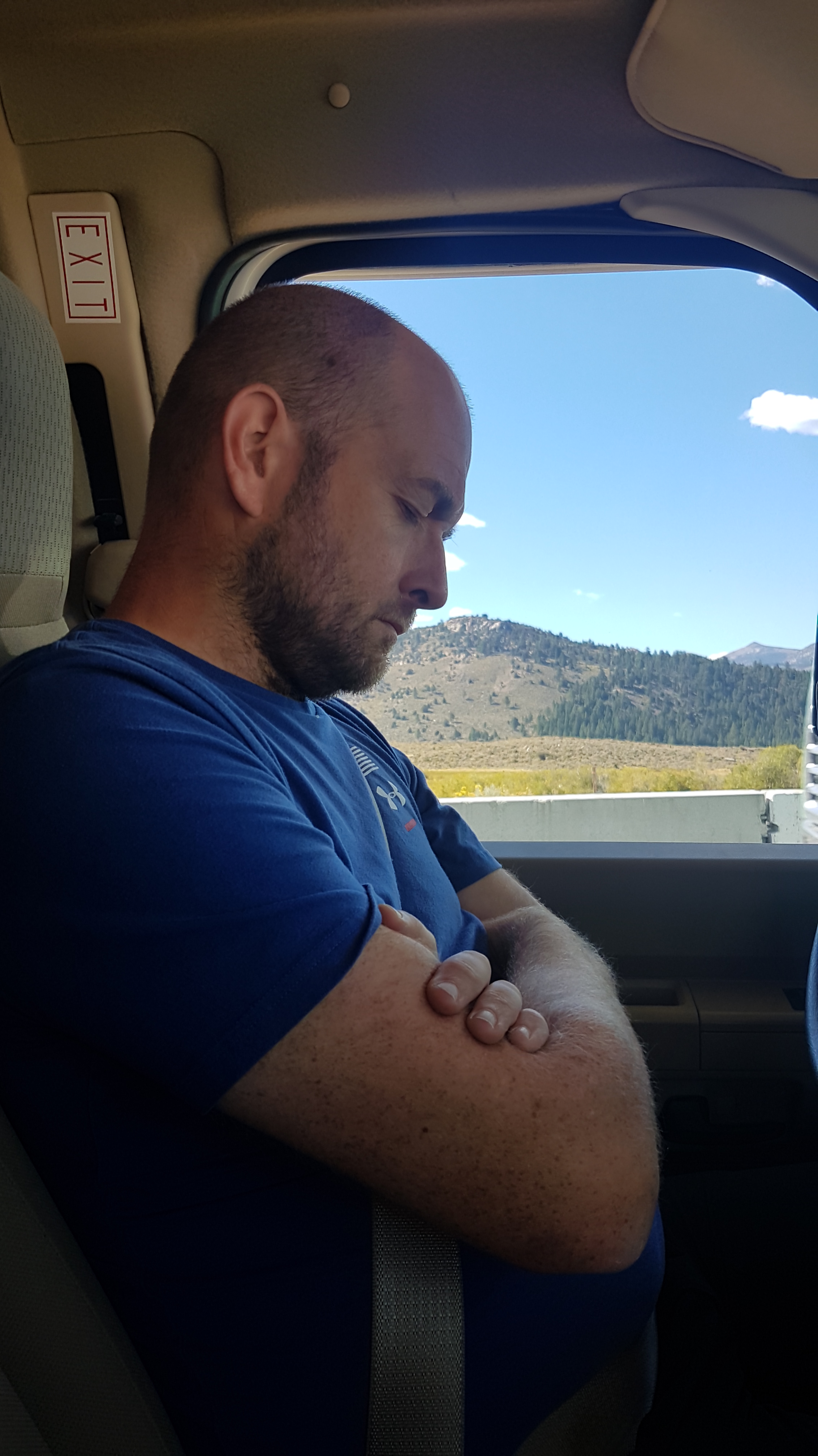 Het is een prima rit door mooie omgeving, maar we zijn wel allemaal moe. De buitenlucht en de wandeling in de warmte slaat ongenadig toe… dufheid to the max. Voor Lizzy geen enkel probleem, die gaat lekker even tukken. Eline probeert wakker te blijven om Rob te ondersteunen bij het rijden, maar ook die gaat voor de bijl en doet een kort dutje. Zelfs Rob moet eraan geloven, Rob!? Jawel, ook Rob slaapt en achter het stuur nog wel. Als we zo’n 10 minuten stil staan bij wegwerkzaamheden doet Rob een powernap van 2 of 3 minuten. Raar, maar waar, hij is zo’n persoon die dit kan; superkort slapen en zich daarna als herboren voelen.
