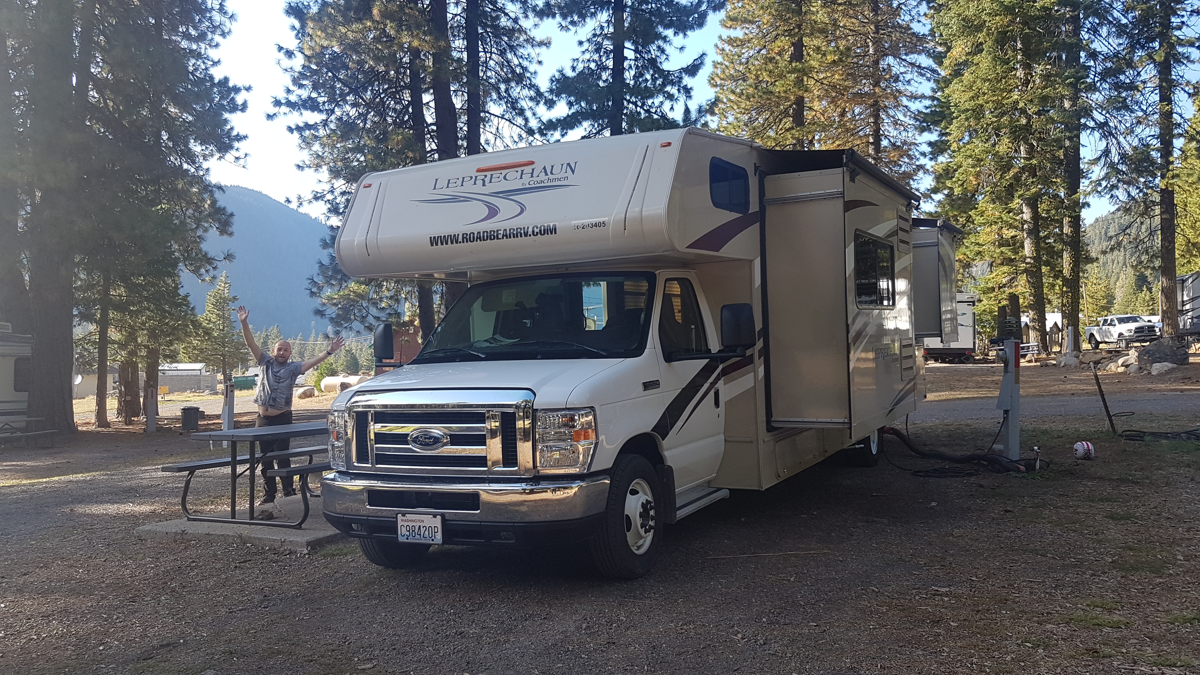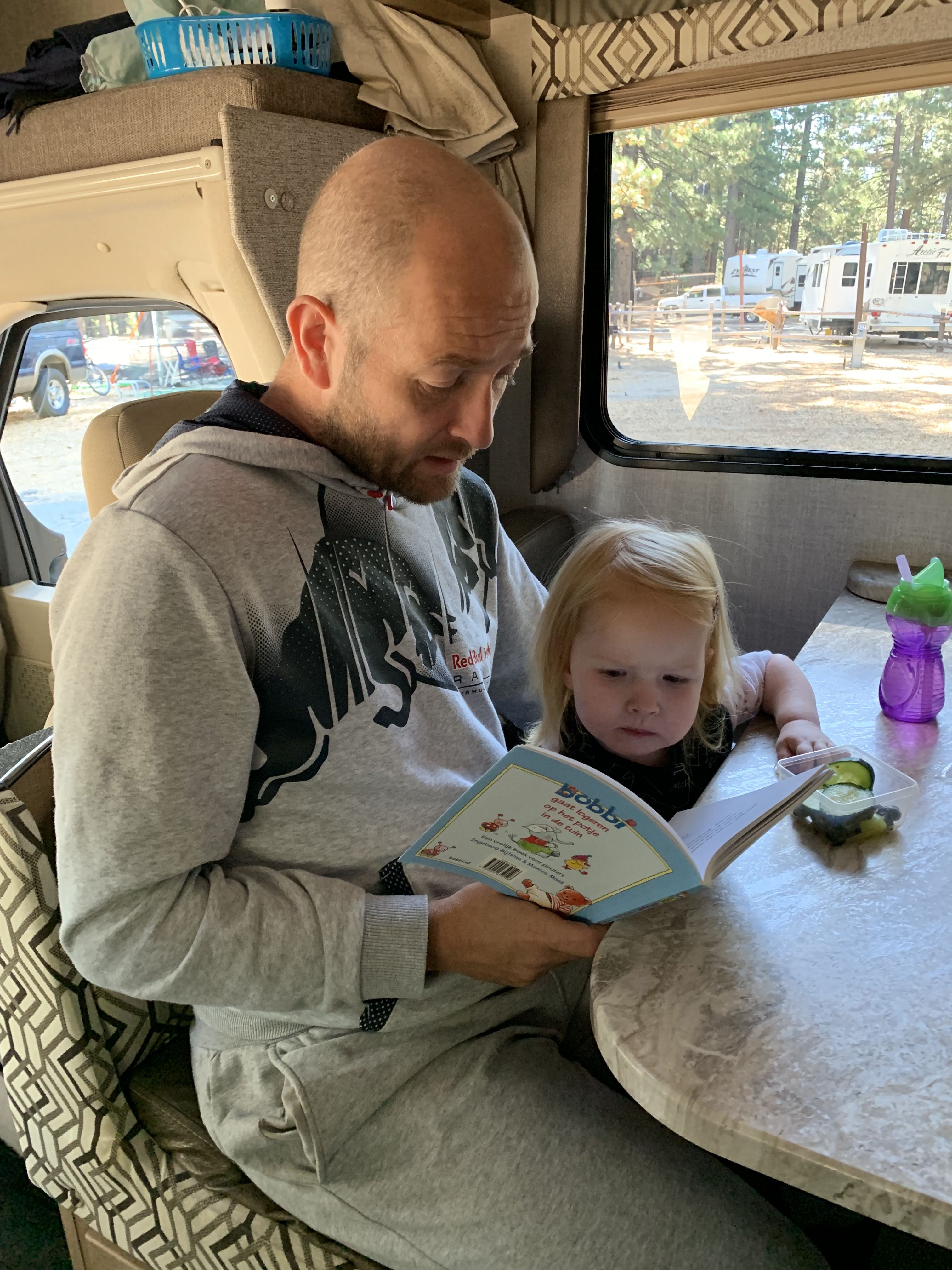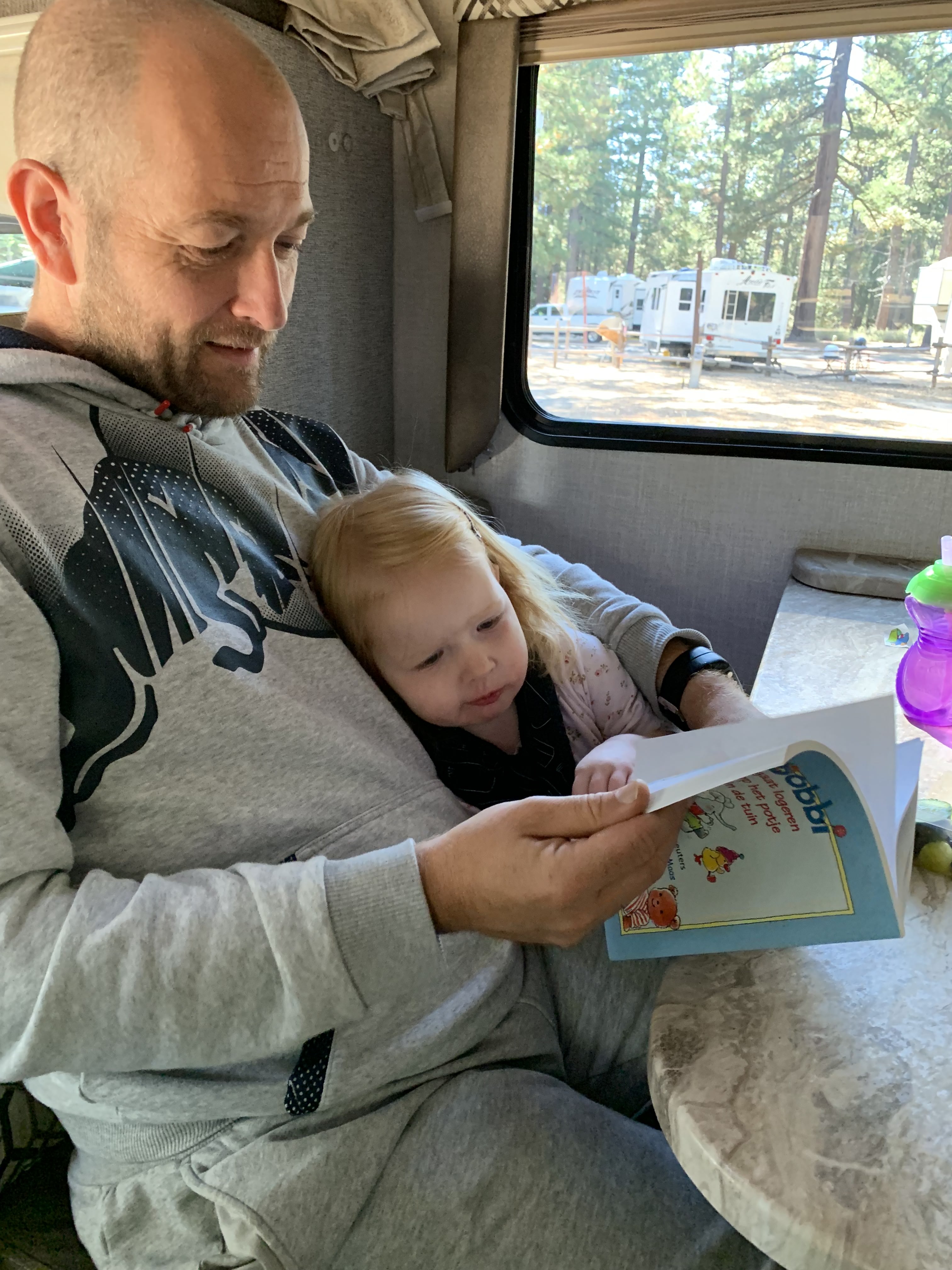 Rond half 5 komen we aan bij onze campground, een mooi plekje, maar wel met erg oude voorzieningen. Gelukkig hebben we riolering bij de kampeerplek, die sluiten we dus gewoon aan zodat we niet naar het toiletgebouw hoeven. We installeren ons en Eline gaat eten koken terwijl Rob en Lizzy samen spelen en boekjes lezen. Rond kwart voor 6 zitten we aan een heerlijk Hollands maaltje. Omdat we geen internet hebben en we nog wel plannen moeten maken voor morgen, zitten we die avond om beurten voor bij de receptie buiten op het bankje om via Wifi wat dingen uit te zoeken en de volgende slaapplek te reserveren. Dat hadden we beter gisteren vast kunnen regelen. Ach zo leren we elke dag weer wat bij en alsnog redden we ons prima!! Sterker nog, we genieten volop.
