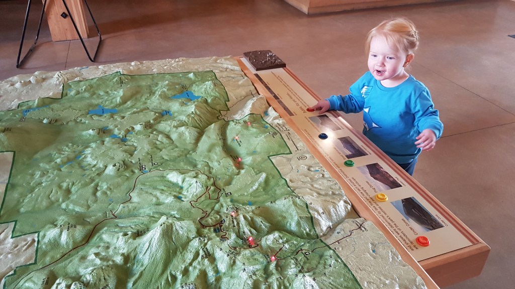 We rijden weer terug, langs onze camping, bye tot nooit weer ziens haha en door naar Lassen Volcanic National Park wat gelukkig maar een klein stukje is vanaf daar. Bij de ingang krijgen we te horen dat het gratis is vandaag, eh ok, dat is tof! Al 2 nationale parken bezocht en nog geen entree betaald. We krijgen een parkkrantje en plattegrond en mogen zo doorrijden. De eerste stop is het Visitor Center waar we wat gave souvenirs scoren en Lizzy zich vermaakt met een kaart van het park waar ze op knopjes kan drukken om lichtjes te laten branden.