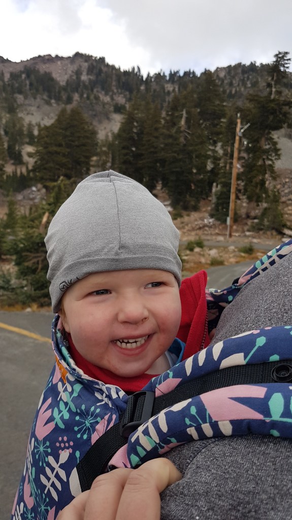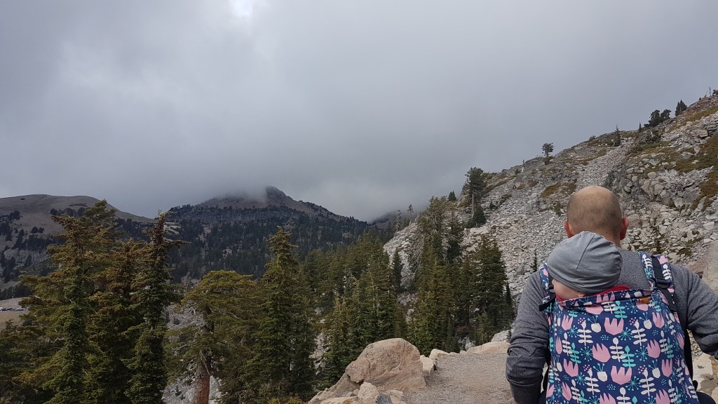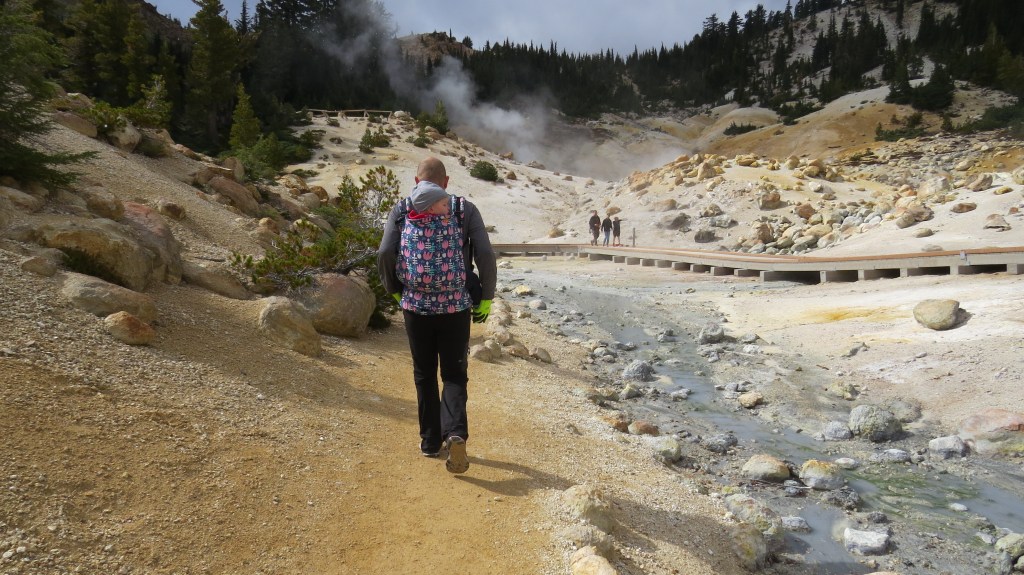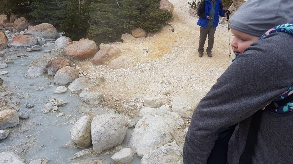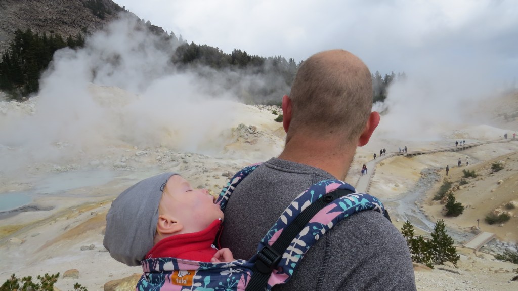 Het park verrast gelijk, de meest prachtige vergezichten op het berglandschap en een slingerweg langs de bergen omhoog. Het duurt niet lang voor de eerste stoomwolk van een fumarole zien. Wat we ook zien en best veel ook… sneeuw! Eline heeft een relatief korte wandeling uitgezocht waarbij we geisers van dichtbij kunnen zien. Het is behoorlijk druk bij het begin van de wandeling, maar gelukkig vinden we een parkeerplaats een stukje verderop bij een meertje en de toiletten. En wat gebeurde er toen we bijna op de parkeerplaats waren? Het ging sneeuwen! Liepen we de afgelopen dagen nog op slippers, nu zoeken we onze warmste kleding en handschoenen op. Lizzy gaat in de Tula en we gaan op pad. Het blijft zachtjes sneeuwen en Lizzy is moe, ze vind er niets aan helaas. Gelukkig mag ze papa’s muts op en na een poosje valt ze heerlijk in slaap op Rob zijn rug. Precies wat ze nodig had. Wij wandelen rustig verder en genieten van het uitzicht. Het eerste deel van de wandeling is een makkie, beetje omhoog over een deels geasfalteerd pad. Als we stoom beginnen te zien, wordt het pittig, een flinke daling met erg oneffen terrein, goed opletten dus. De geur van zwavel wordt al snel sterker en we zien flink wat fumarolen van dichtbij. Verder genieten we onder andere van borrelende modderpoeltjes en een beekje stromend zwavelwater. Lizzy is inmiddels wakker geworden en vindt alles ook heerlijk interessant. Ze kijkt alle kanten op, we krijgen er zelfs opmerkingen over van de mensen die achter ons lopen. Na het steile stukje terug omhoog, is het daarom nu driedubbel genieten van de wandeling en het uitzicht. We hoeven vrijwel alleen maar naar beneden te wandelen en af en toe komt er ook nog een eekhoorn voorbij. Als Eline nog een paar foto’s van het meer (Lake Helen) maakt op weg naar de camper, roept Lizzy ‘mama, kom je nog?’ En ze ligt daarna helemaal in een deuk. Geweldig, heerlijk kind!