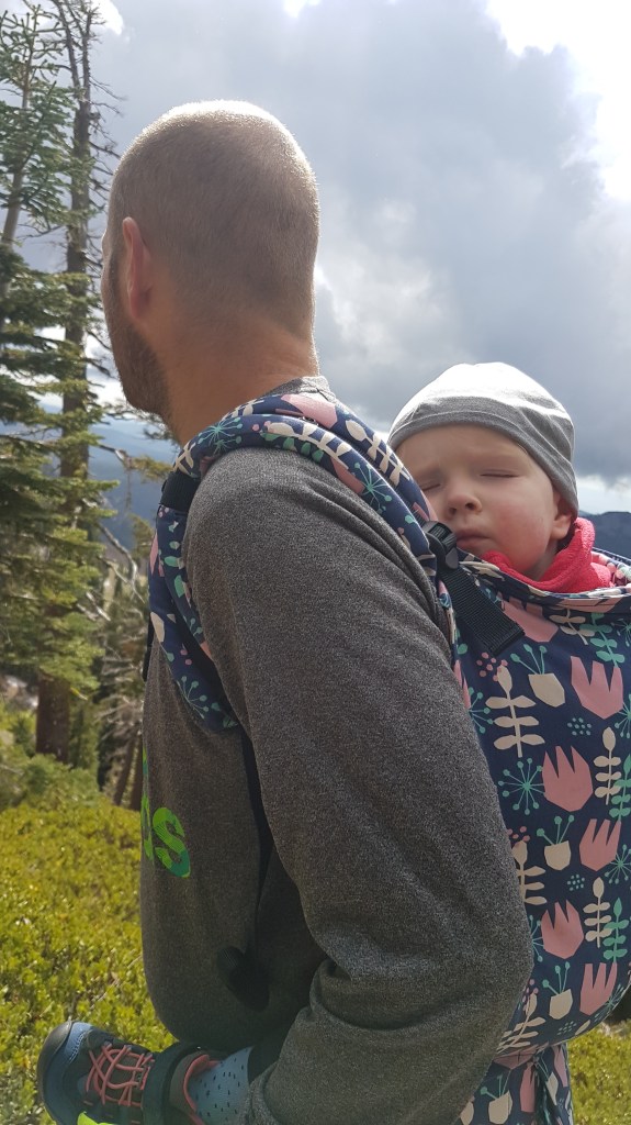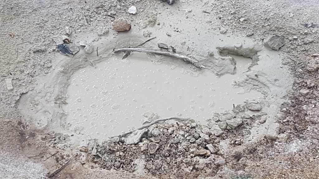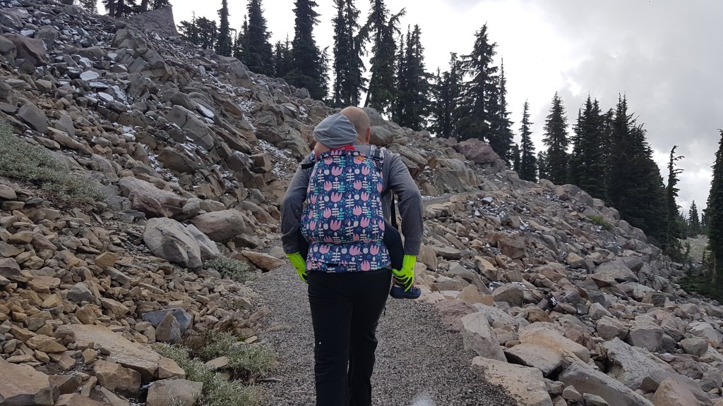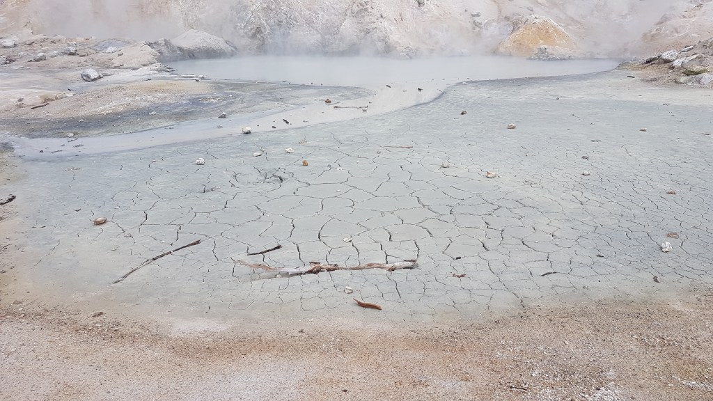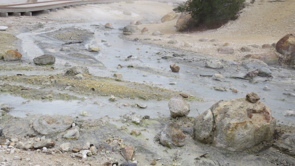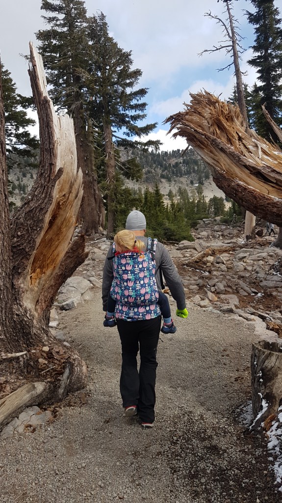 Het park verrast gelijk, de meest prachtige vergezichten op het berglandschap en een slingerweg langs de bergen omhoog. Het duurt niet lang voor de eerste stoomwolk van een fumarole zien. Wat we ook zien en best veel ook… sneeuw! Eline heeft een relatief korte wandeling uitgezocht waarbij we geisers van dichtbij kunnen zien. Het is behoorlijk druk bij het begin van de wandeling, maar gelukkig vinden we een parkeerplaats een stukje verderop bij een meertje en de toiletten. En wat gebeurde er toen we bijna op de parkeerplaats waren? Het ging sneeuwen! Liepen we de afgelopen dagen nog op slippers, nu zoeken we onze warmste kleding en handschoenen op. Lizzy gaat in de Tula en we gaan op pad. Het blijft zachtjes sneeuwen en Lizzy is moe, ze vind er niets aan helaas. Gelukkig mag ze papa’s muts op en na een poosje valt ze heerlijk in slaap op Rob zijn rug. Precies wat ze nodig had. Wij wandelen rustig verder en genieten van het uitzicht. Het eerste deel van de wandeling is een makkie, beetje omhoog over een deels geasfalteerd pad. Als we stoom beginnen te zien, wordt het pittig, een flinke daling met erg oneffen terrein, goed opletten dus. De geur van zwavel wordt al snel sterker en we zien flink wat fumarolen van dichtbij. Verder genieten we onder andere van borrelende modderpoeltjes en een beekje stromend zwavelwater. Lizzy is inmiddels wakker geworden en vindt alles ook heerlijk interessant. Ze kijkt alle kanten op, we krijgen er zelfs opmerkingen over van de mensen die achter ons lopen. Na het steile stukje terug omhoog, is het daarom nu driedubbel genieten van de wandeling en het uitzicht. We hoeven vrijwel alleen maar naar beneden te wandelen en af en toe komt er ook nog een eekhoorn voorbij. Als Eline nog een paar foto’s van het meer (Lake Helen) maakt op weg naar de camper, roept Lizzy ‘mama, kom je nog?’ En ze ligt daarna helemaal in een deuk. Geweldig, heerlijk kind!